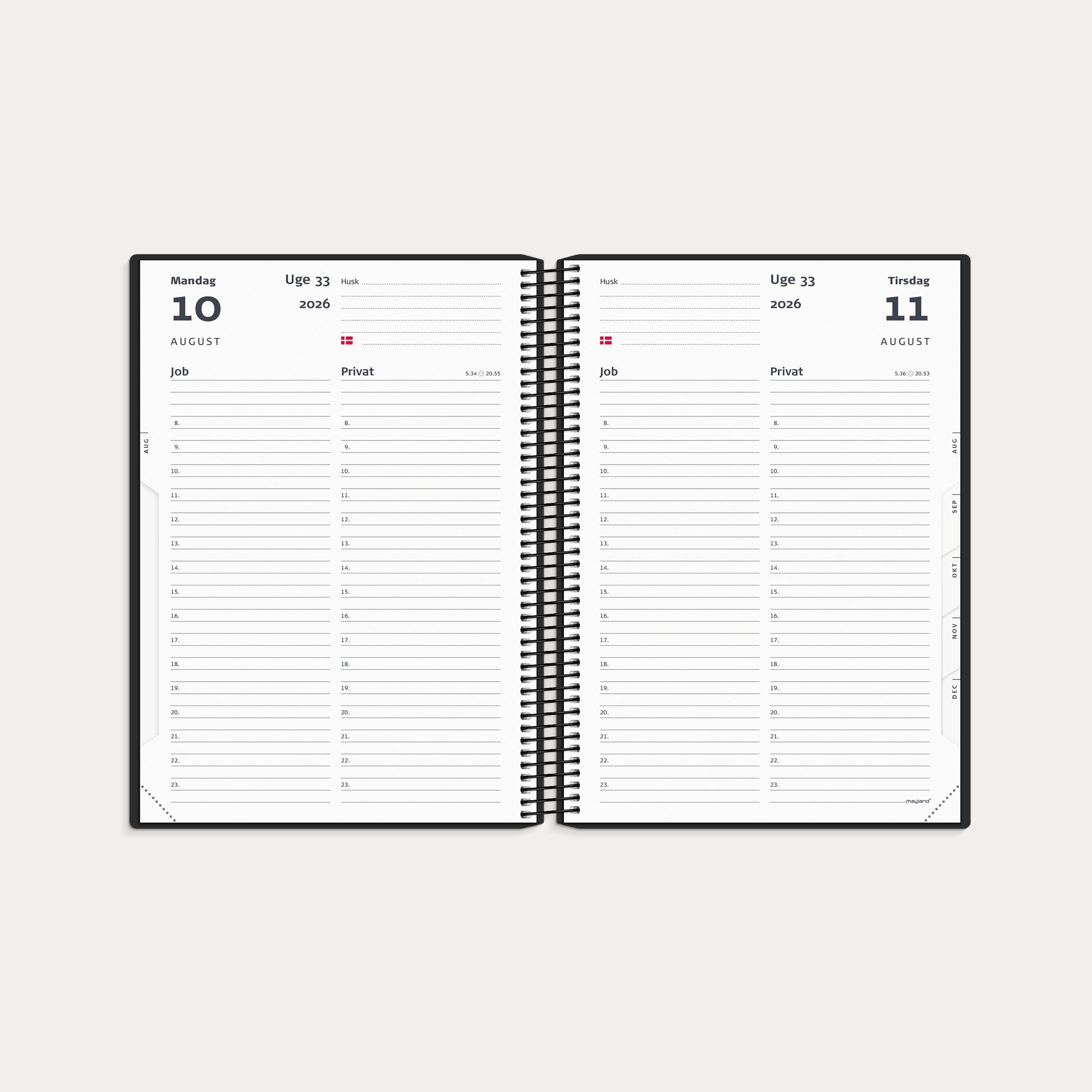 Smart og funktionel dagkalender, hvor du nemt kan holde styr på både dine jobrelaterede og private aftaler og aktiviteter. Kalenderen er spiralbundet med et omslag i sort kunstskind, som giver kalenderen et flot og elegant udseende. Kalenderen er inddelt med en dag pr. side og hver dag er opdelt i to kolonner – en til job og en til privat. Dagkalenderen indeholder et timeopdelt kalenderskema fra kl. 8-23 i hver kolonne, så du kan notere alle dagens aftaler og opgaver og på den måde sikre dig et overblik over dagens aktiviteter. Dertil finder du en udfoldelig årsplanner, en projektplanner samt en lomme til løse papirer.