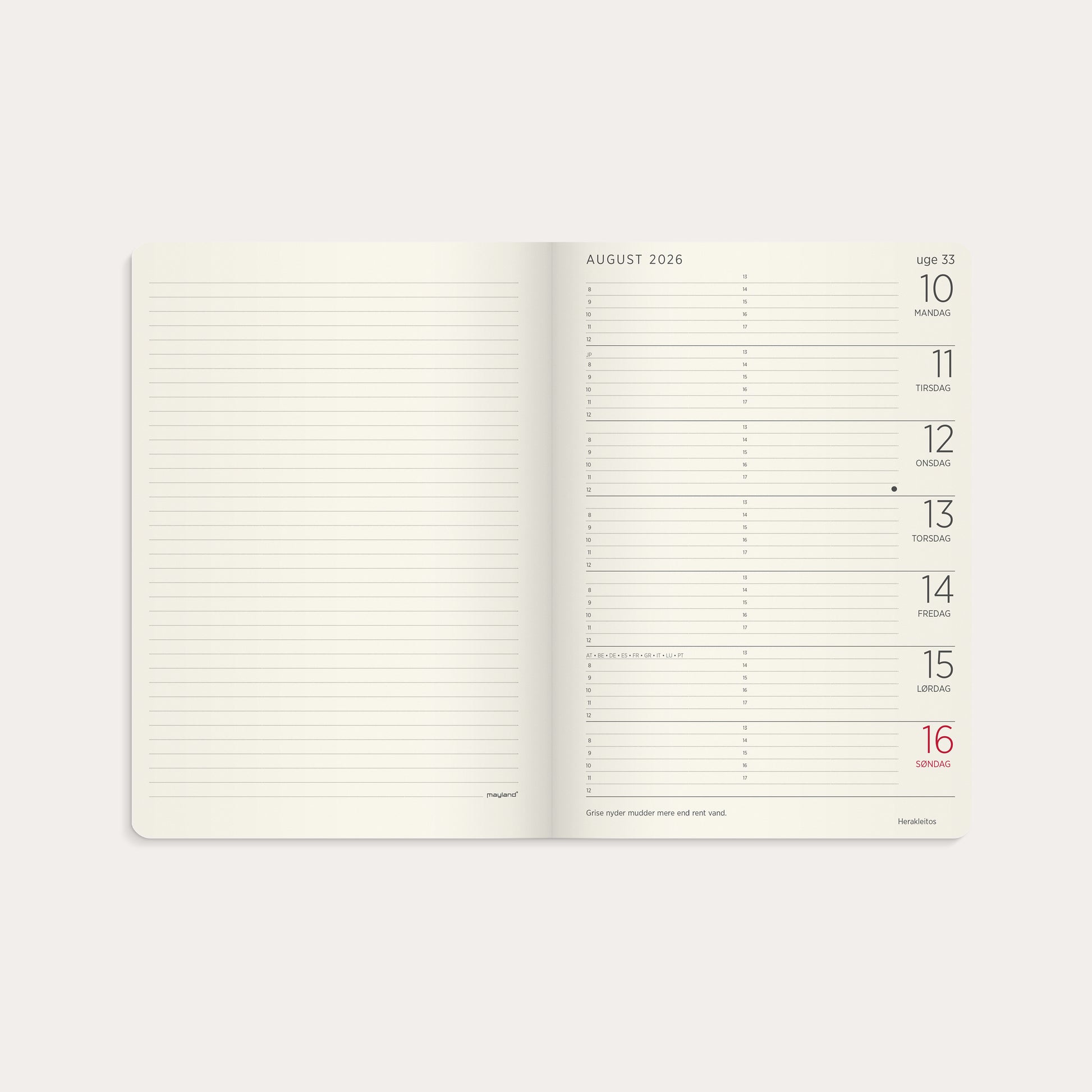 En stilren og eksklusiv kalender med fokus på tydelig planlægning. En klassisk kalender med cremefarvet papir med en uge pr. opslag, hvor venstresiden har linjerede sider til noteringer, og højresiden har timeinddeling. Bagerst er der ekstra sider til noteringer og en letoverskuelig årsplanner.