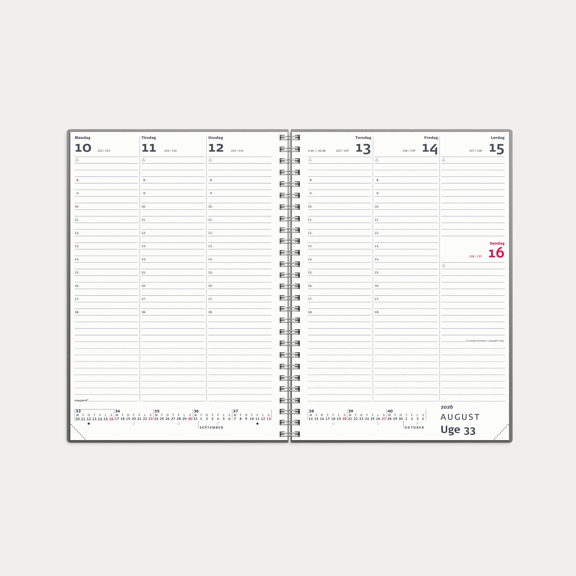 Ugekalender med en mørkegrå forside. Kalenderen er spiralbundet med et omslag i PP-plast, så du nemt kan bladre i kalenderen. Kalenderen er inddelt med en uge pr. opslag og indeholder et kalenderskema i moderne layout med timeopdeling fra kl. 8-18, hvilket giver dig et overskueligt overblik over ugens aftaler og planer. Dertil finder du en tidslinje og månedsoversigt nederst på hvert opslag, en udfoldelig årsplanner, en projektplanner, atlas i farver samt masser af praktisk information.