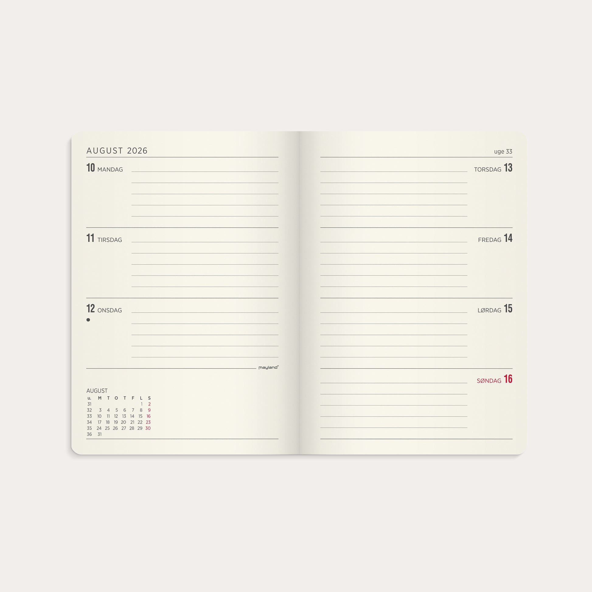En stilren og eksklusiv kalender med fokus på tydelig planlægning. En klassisk kalender med cremefarvet papir med en uge pr. opslag. Bagerst er der ekstra sider til noteringer og en letoverskuelig årsplanner.