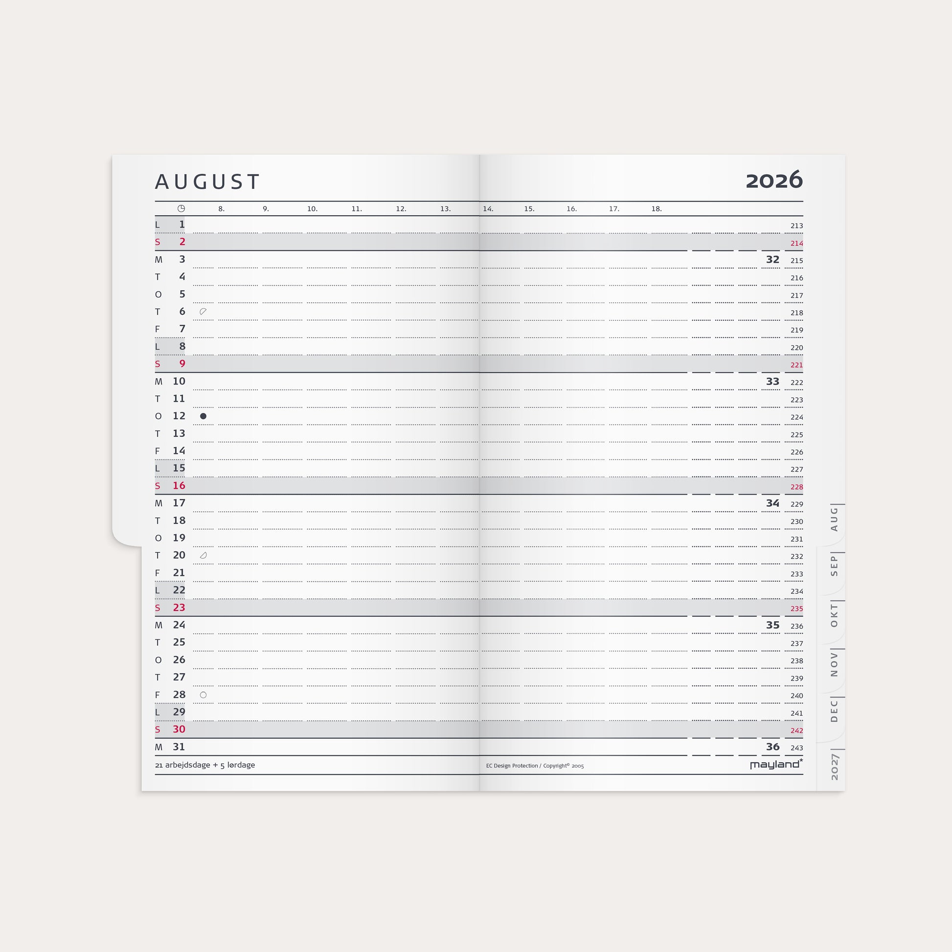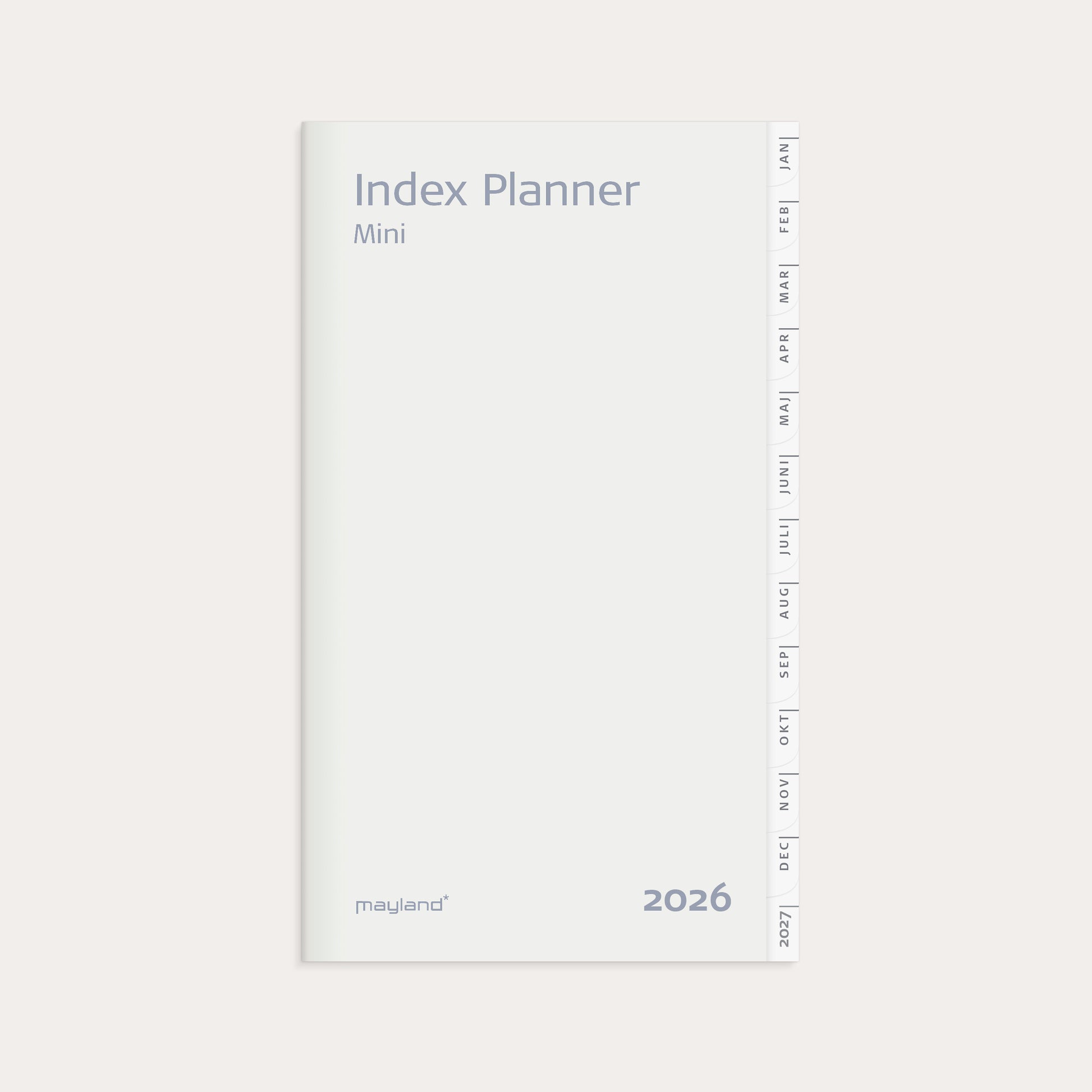 Refill til din mini index planner. Kalender-refillen er inddelt med en måned pr. opslag og indeholder et timeopdelt kalenderskema fra kl. 8-18, så du får et godt overblik over hele månedens aftaler og aktiviteter.