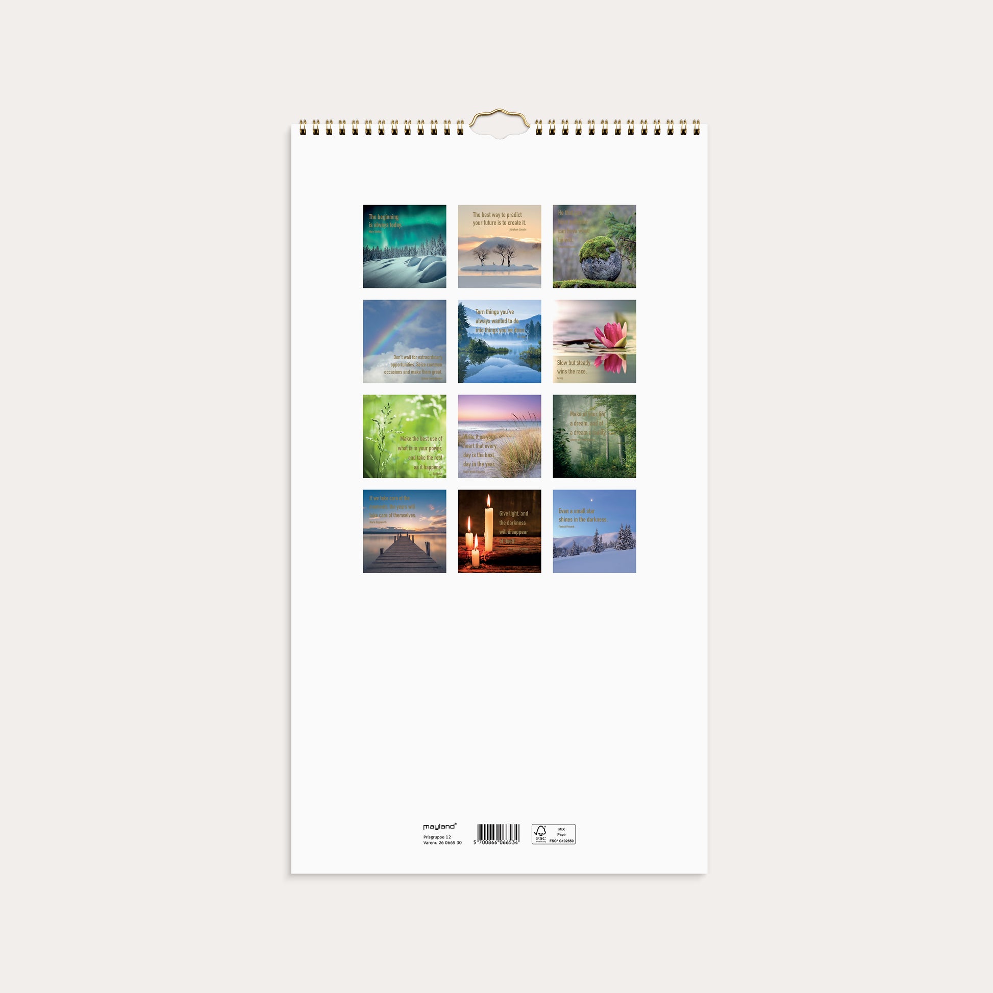 Billedkalender i karton til vægophæng. Kalenderen er spiralindbundet og er illustreret med 12 flotte billeder samt positive citater i guldfoliepræg. Vægkalenderen giver dig en oversigt over 1 måned ad gangen, så du hurtigt og nemt kan skabe et godt og overskueligt overblik over den enkelte måned.