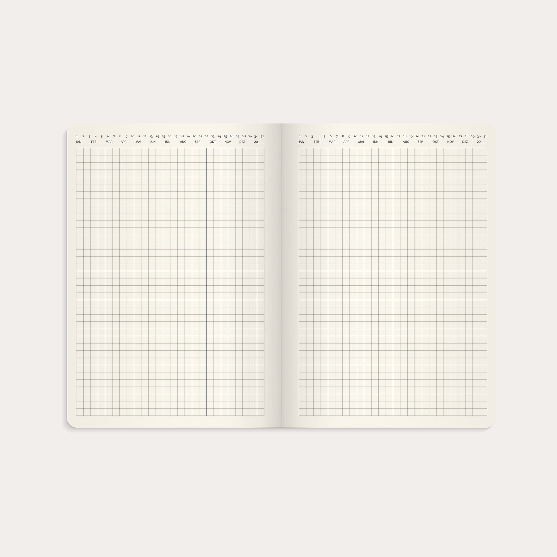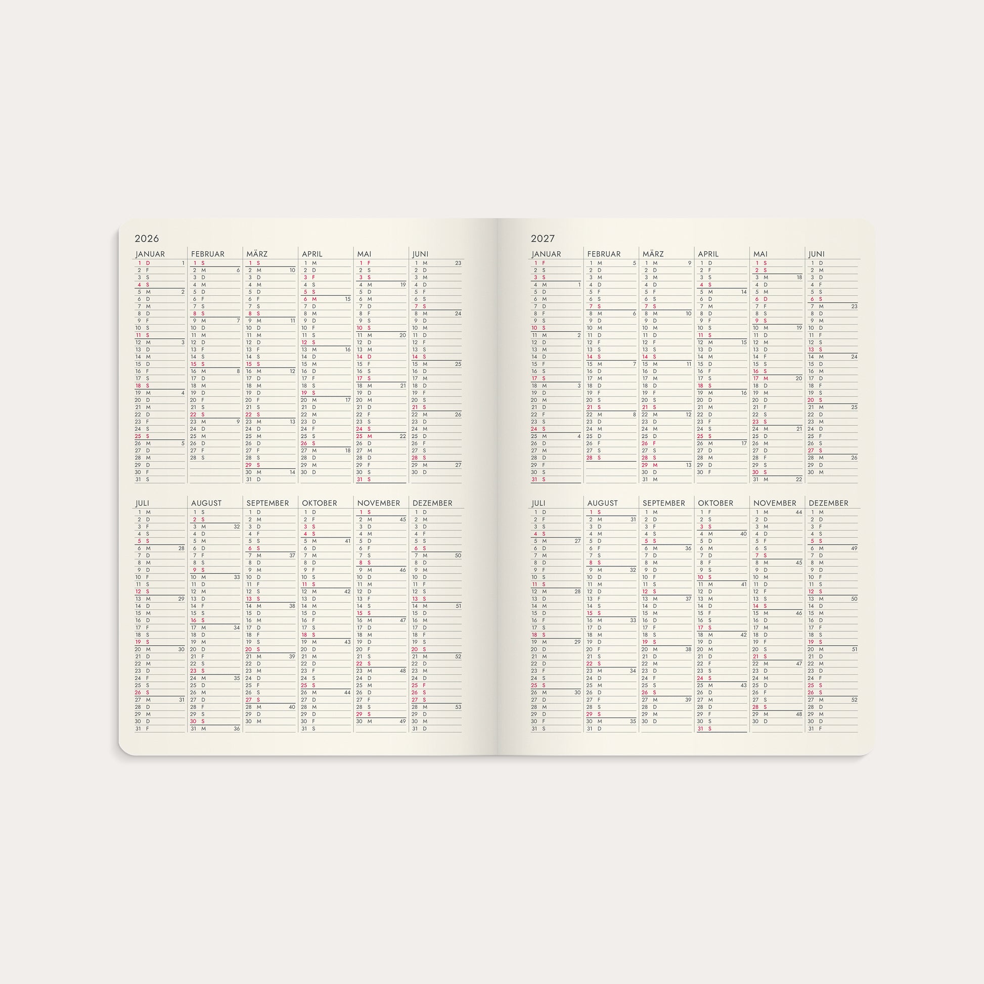 Agency Forma Deluxe ist ein gebundener Kalender mit cremefarbenem Papier, der dank seiner einzigartigen Bindungstechnik flach auf der Tischoberfläche liegt, wenn du schreibst. Der Kalender bietet eine Woche pro Seite, eine vertikale Layout mit Stundenaufteilung von 06-18 und eine Notizfläche am unteren Rand jeder Seite für weiterführende Reflexionen.