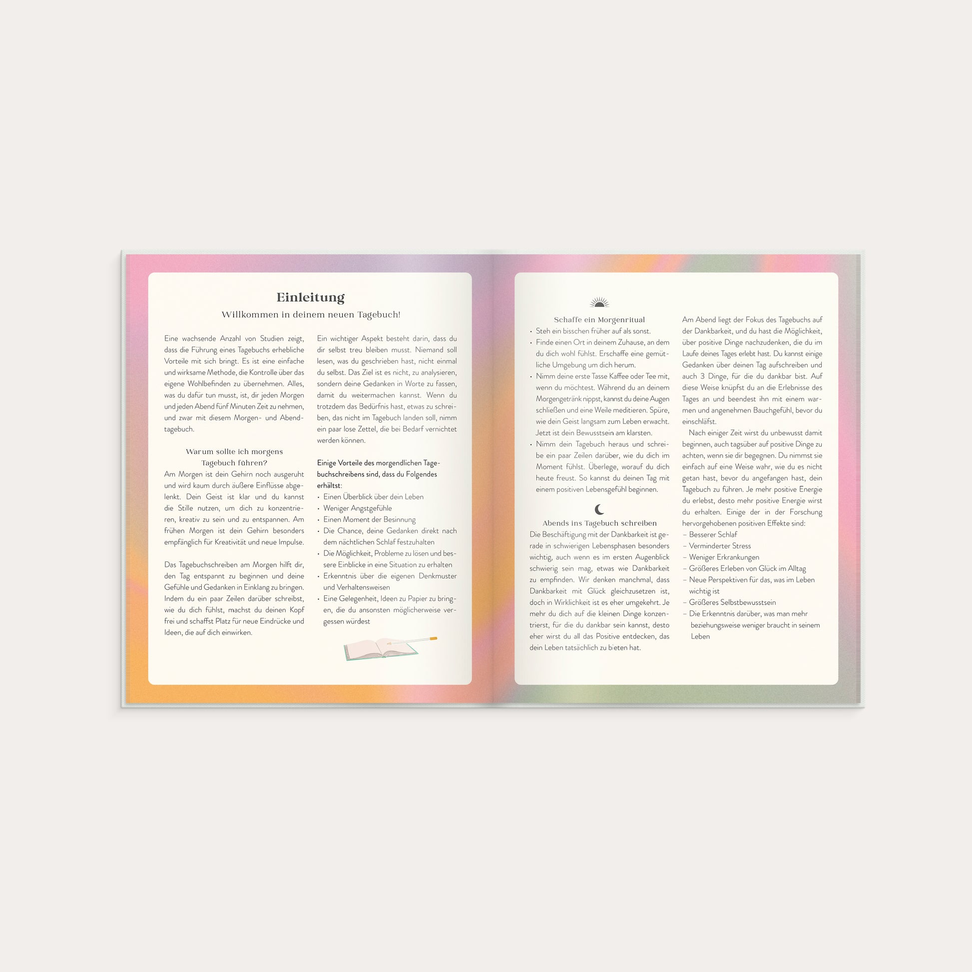 Immer mehr Studien zeigen die großen Vorteile des Tagebuchschreibens auf. Es ist eine einfache und kraftvolle Methode, um dein Wohlbefinden zu verbessern. Alles, was du tun musst, ist, jeden Morgen und Abend fünf Minuten deiner Zeit zusammen mit diesem Tagebuch zu investieren.