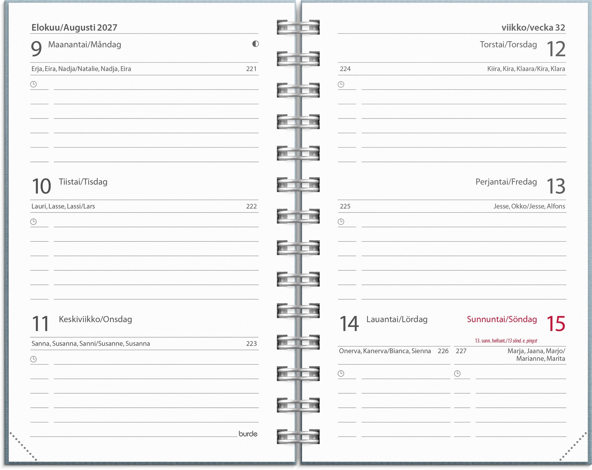 Linen textile cover with embossed year that gives a soft and elegant impression. The calendar shows one week per spread. It includes name days, national holidays, flag days, moon phases, annual plans for the period July 2025 – June 2027, schedules, test results, information pages, and calendar tasks. Calendar section: week 33, 2025 - week 4, 2027. Bilingual: Finnish/Swedish. Spiral bound. FSC®.