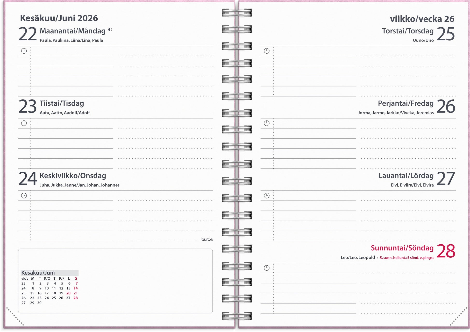 Calendar section: week 29 of 2026 to week 29 of 2027. Trilingual: Finnish/Swedish/English. Twin-wire bound. FSC®.