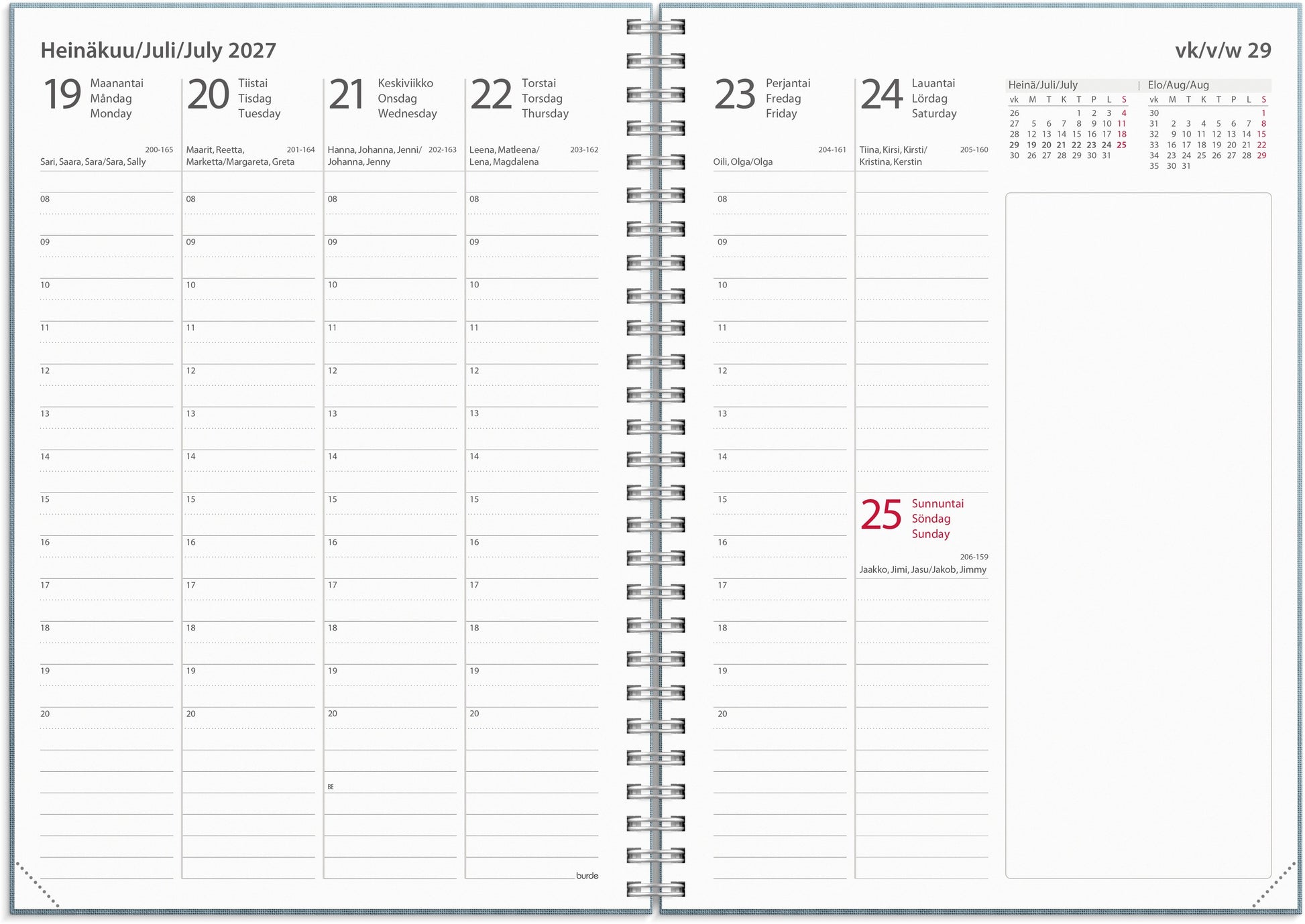 Linen textile cover with embossed year that gives a soft and elegant impression. The calendar shows one week per spread, hourly division from 08:00 to 20:00, a column for notes, calendar overviews for the current and following month. The calendar includes name days, holidays, flag days, moon phases, annual plans for the period July 2025 - July 2027, information pages, schedules, and note pages. Calendar section: week 29, 2025 - week 30, 2026. Trilingual: Finnish/Swedish/English. Spiral bound. FSC®