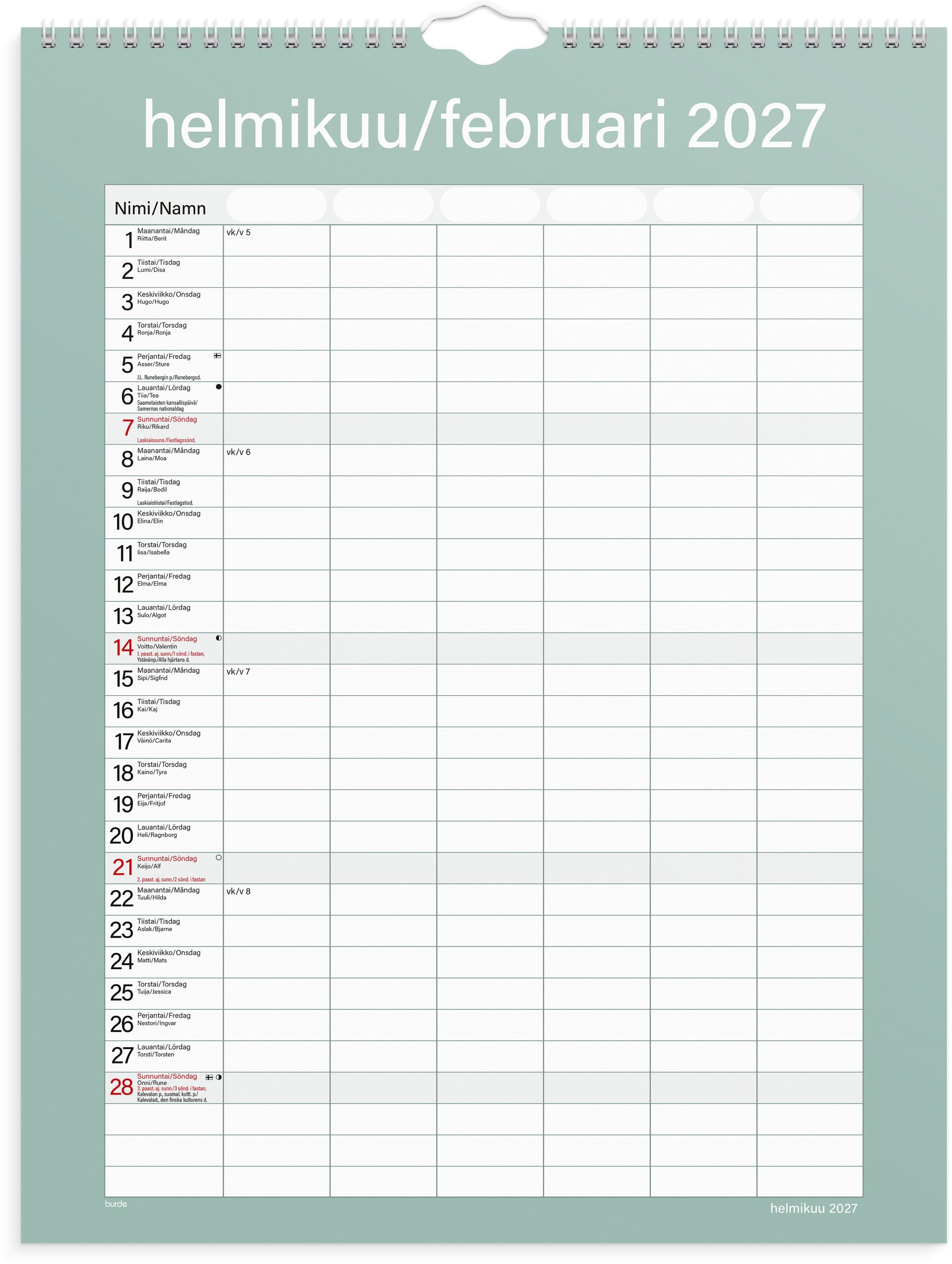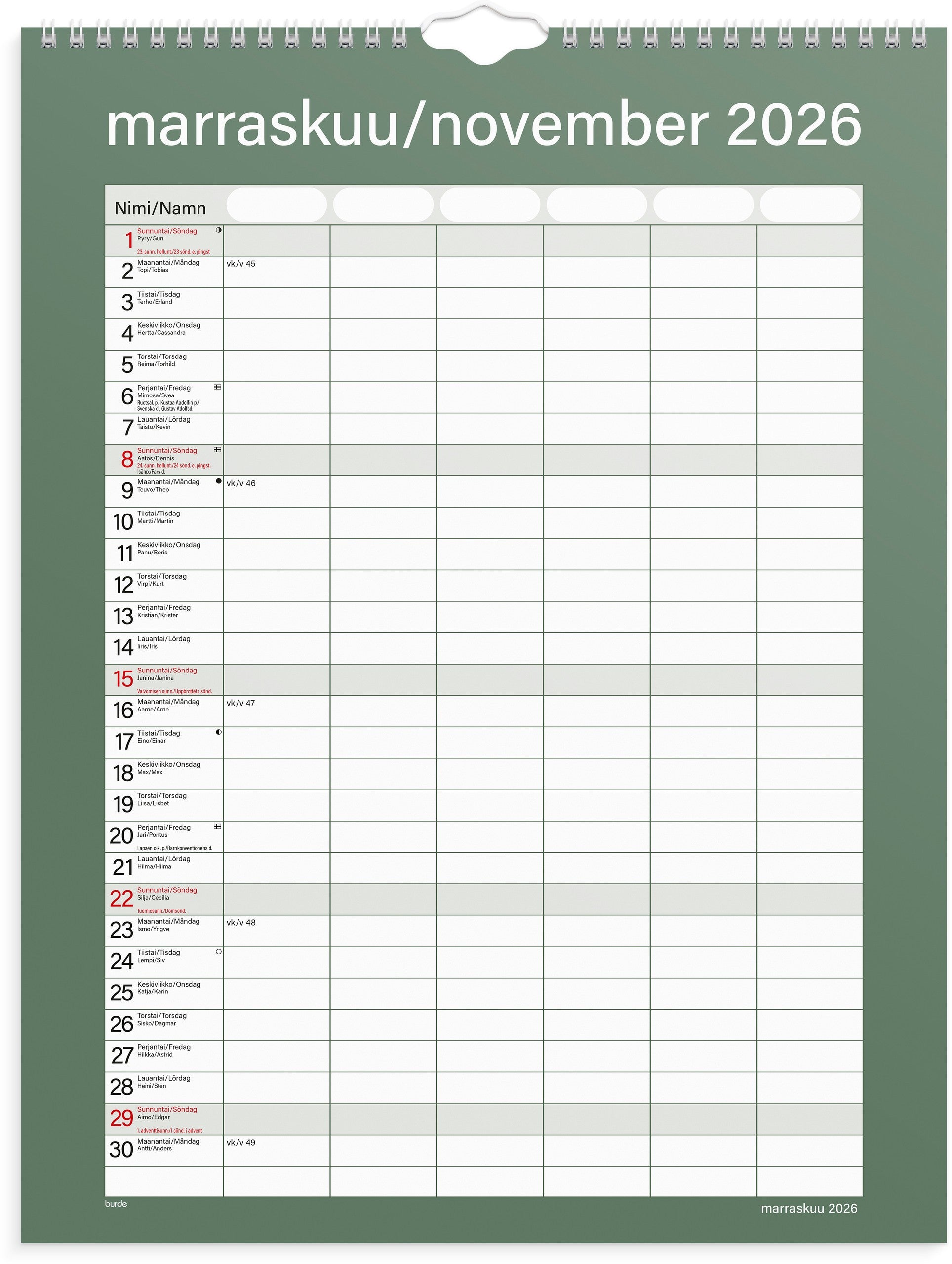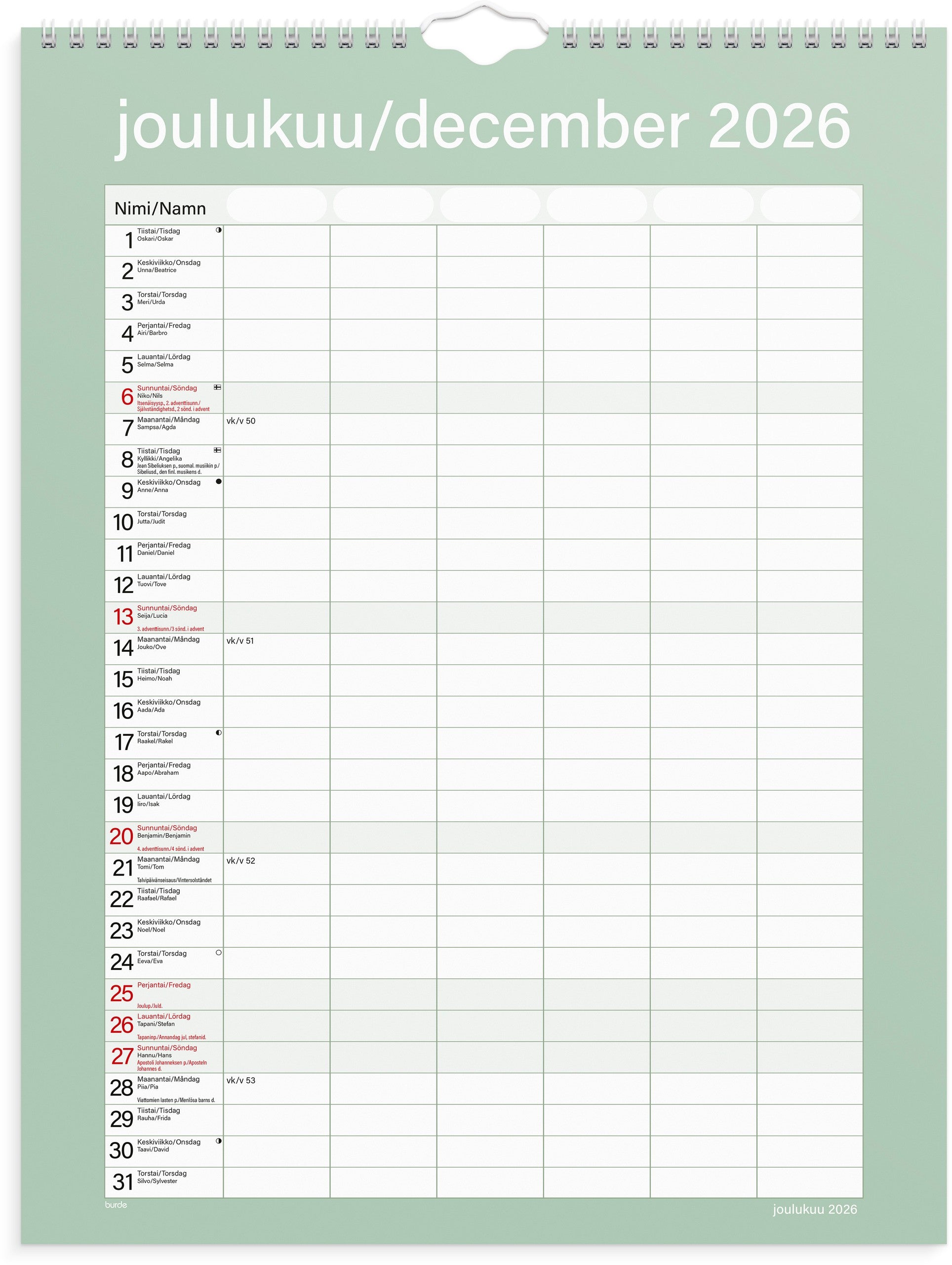 Simple family calendar with six columns. The calendar includes name days, flag days, national holidays, and moon phases. Calendar section: July 2025 - June 2026. Bilingual: Finnish/Swedish. Spiral bound. FSC®.