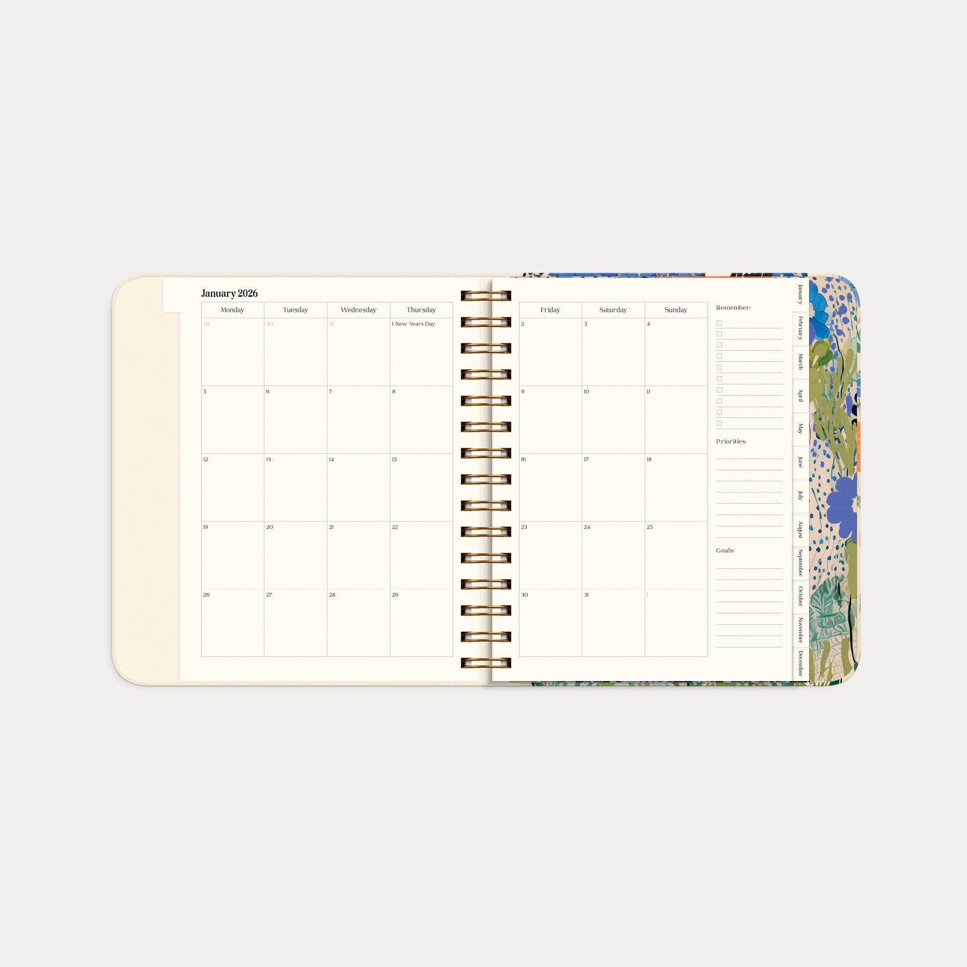 The calendar comes in a brand new, exclusive binding with a hardcover and hidden spiral. Three sheets of colorful stickers for decoration are included.