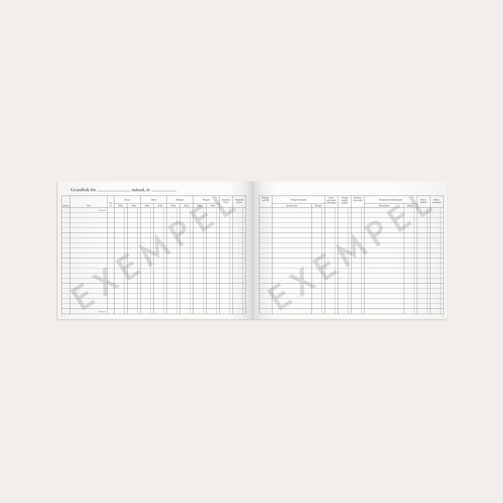 Grundbok/Dagbok med tydlig och funktionell layout, utformad för enkel och strukturerad bokföring. Innehåller 5 dubbelkolumner och 15 enkelkolumner, vilket ger gott om utrymme för detaljerade anteckningar, debet–kredit-registreringar och löpande noteringar.