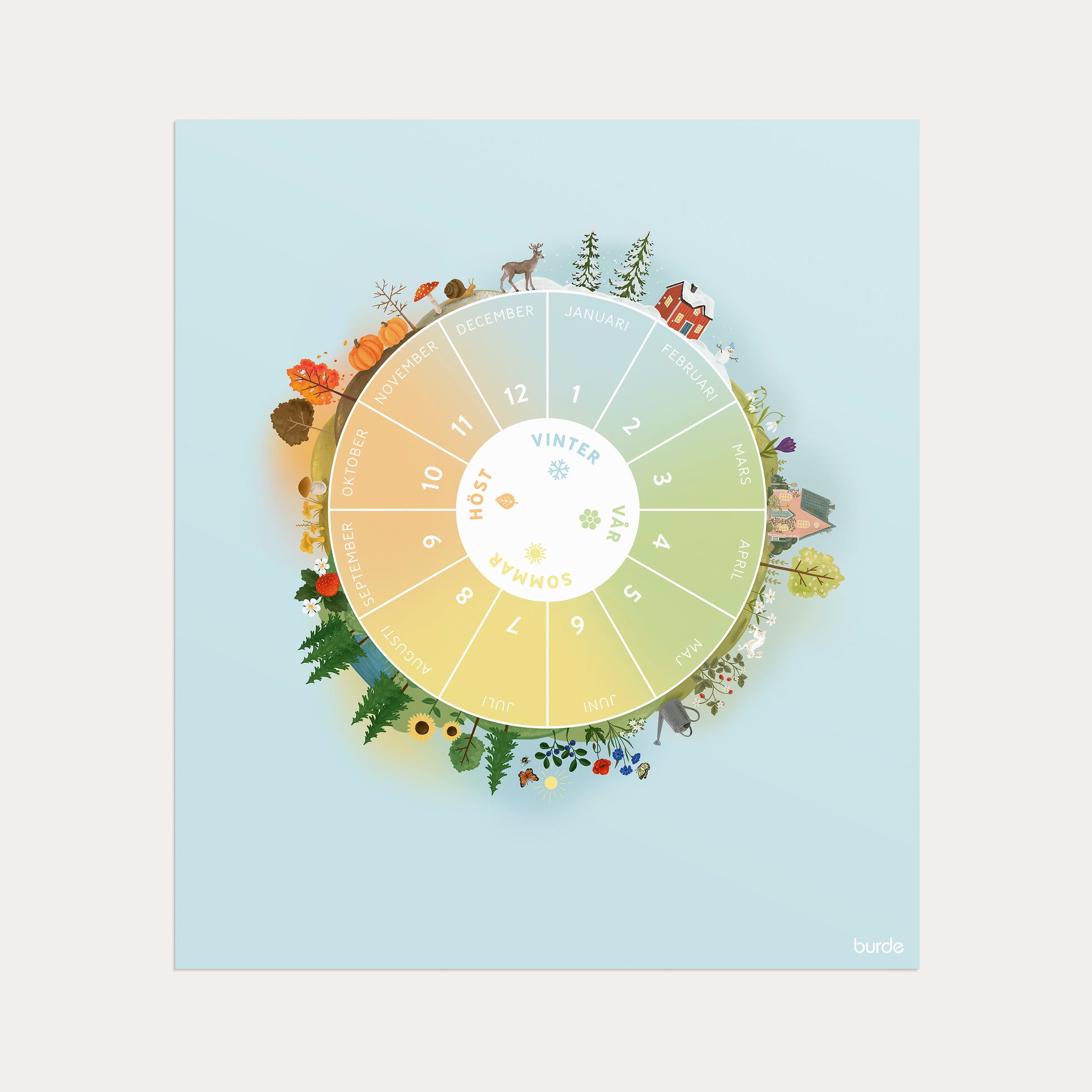 Med kalendern följer en poster med ett årshjul, vars färger återfinns i kalendern. Tanken med detta är att alltid kunna se årshjulet parallellt med månadens uppslag, för att på ett pedagogiskt sätt skapa förståelse för årets gång.