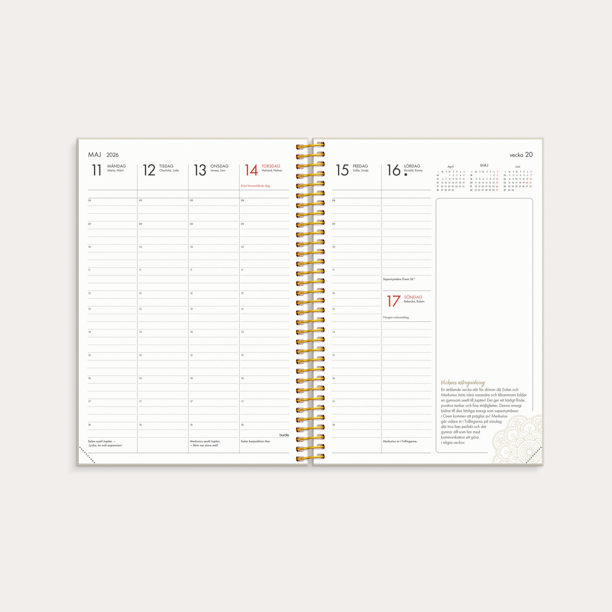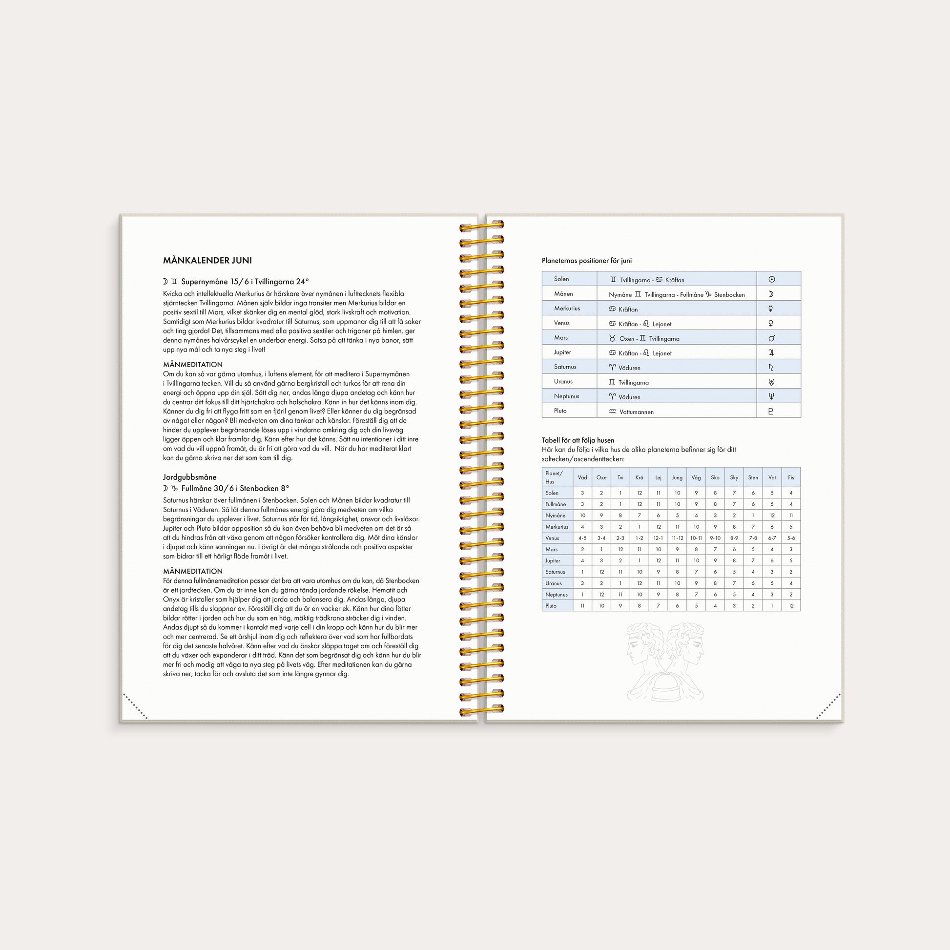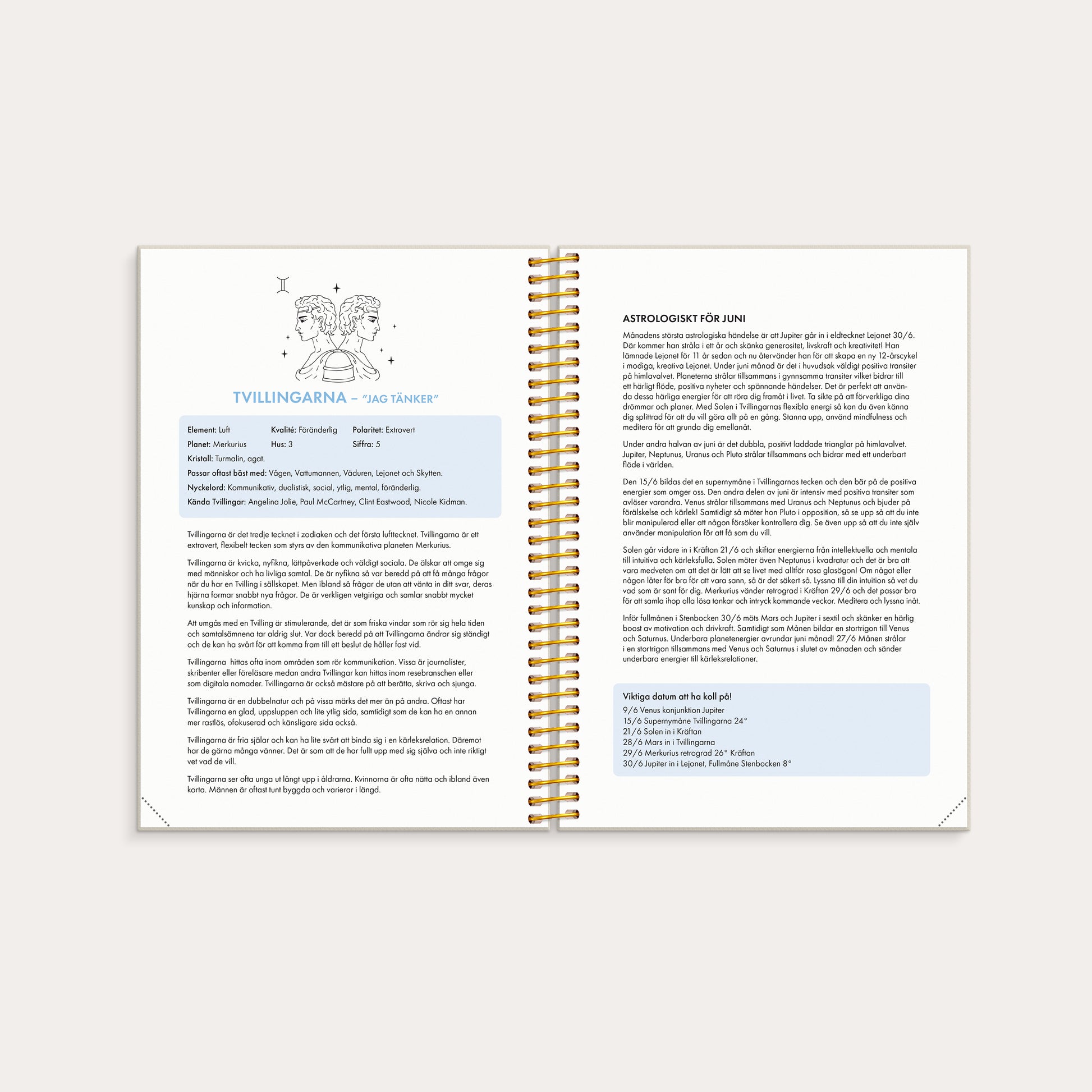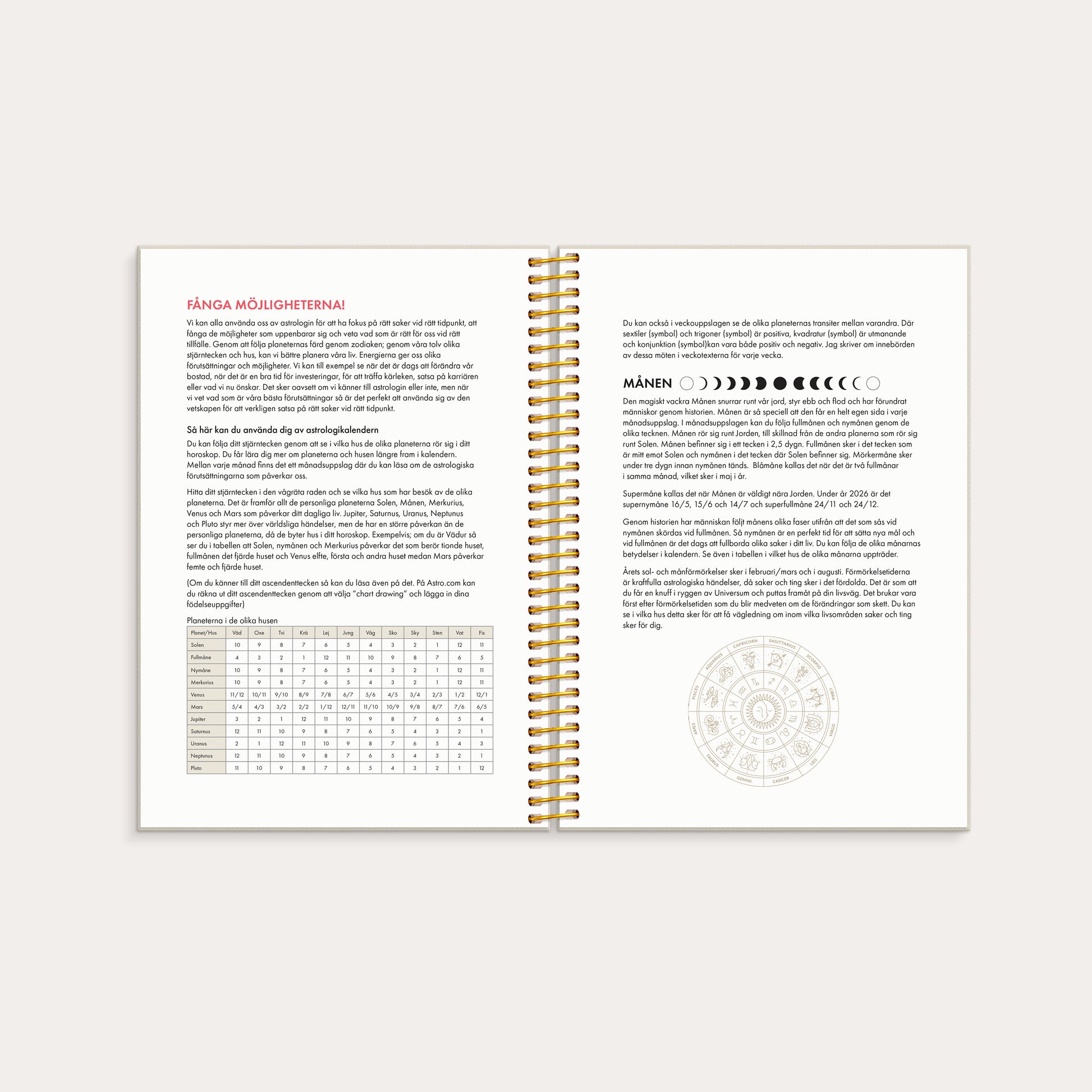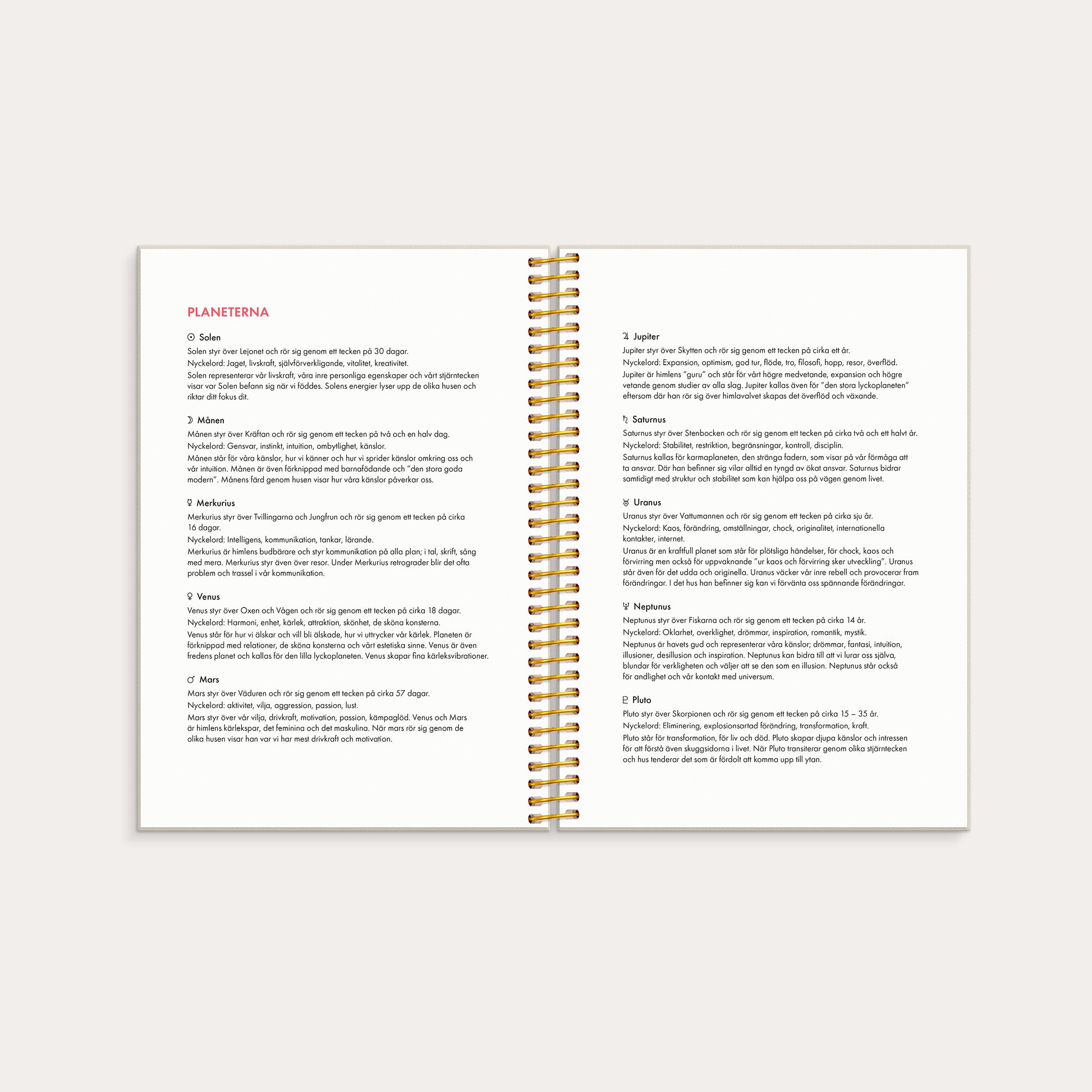 Bjud in astrologin i ditt liv! Ett nytt år står för dörren. Är du redo att börja följa ditt astrologiska flöde? Du får råd om när du ska öka tempot och när du behöver ta det lugnt. Astrologi kan tillämpas på olika områden, både på det stora i livet och på aspekter som kärlek, hälsa, ekonomi, karriär och din personliga utveckling. I den här A5 veckokalendern kommer du att lära dig hur du kan följa ditt eget stjärnteckens inflytande varje vecka och månad under året. I kalendern kommer du att lära dig om astrologi och om dig själv! Den är utformad för att du ska kunna använda den för att skapa det bästa möjliga året! Så att du kan göra rätt saker vid rätt tidpunkt och förstå det energiflöde som omger dig. Varje månad kommer du att kunna läsa om hur nymånens och fullmånens påverkan kan påverka dig. Det kommer att hjälpa dig att ta nya steg vid nymånen och avsluta projekt vid fullmånen.