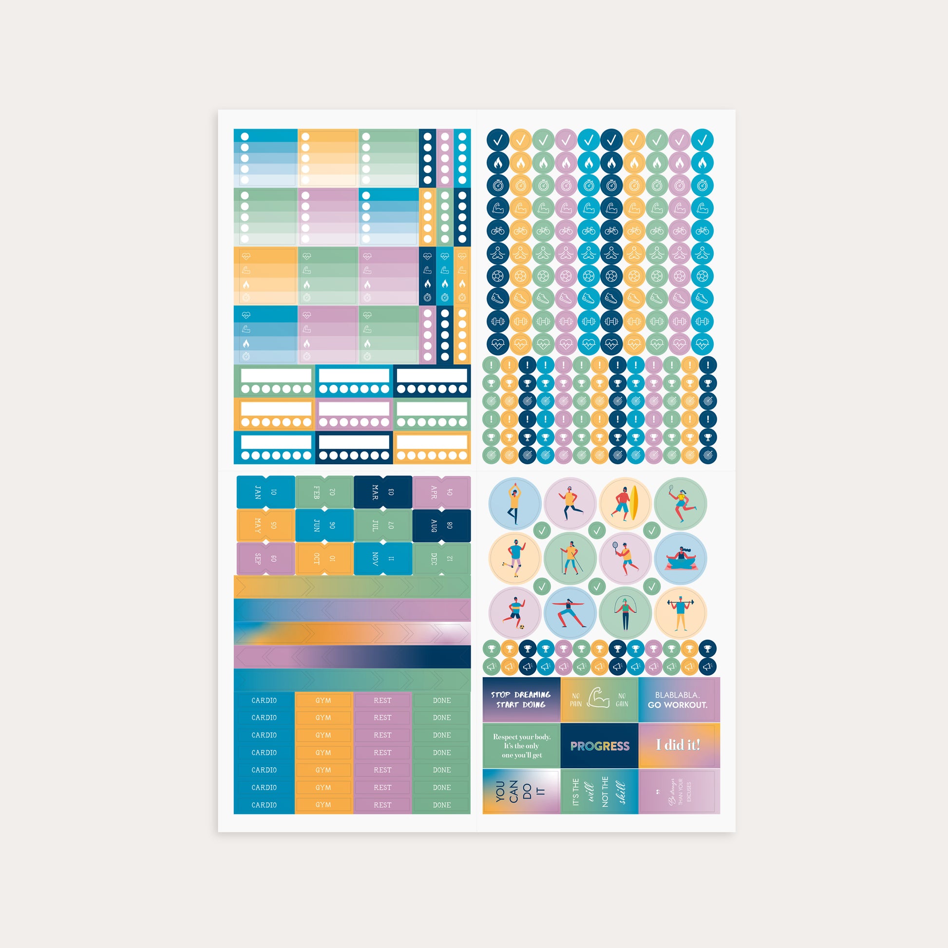 Sticker Sheet focused on workouts and healthy habits. Here you'll find stickers with motivating quotes, icons for various types of exercise, trackers and lists (and more!)