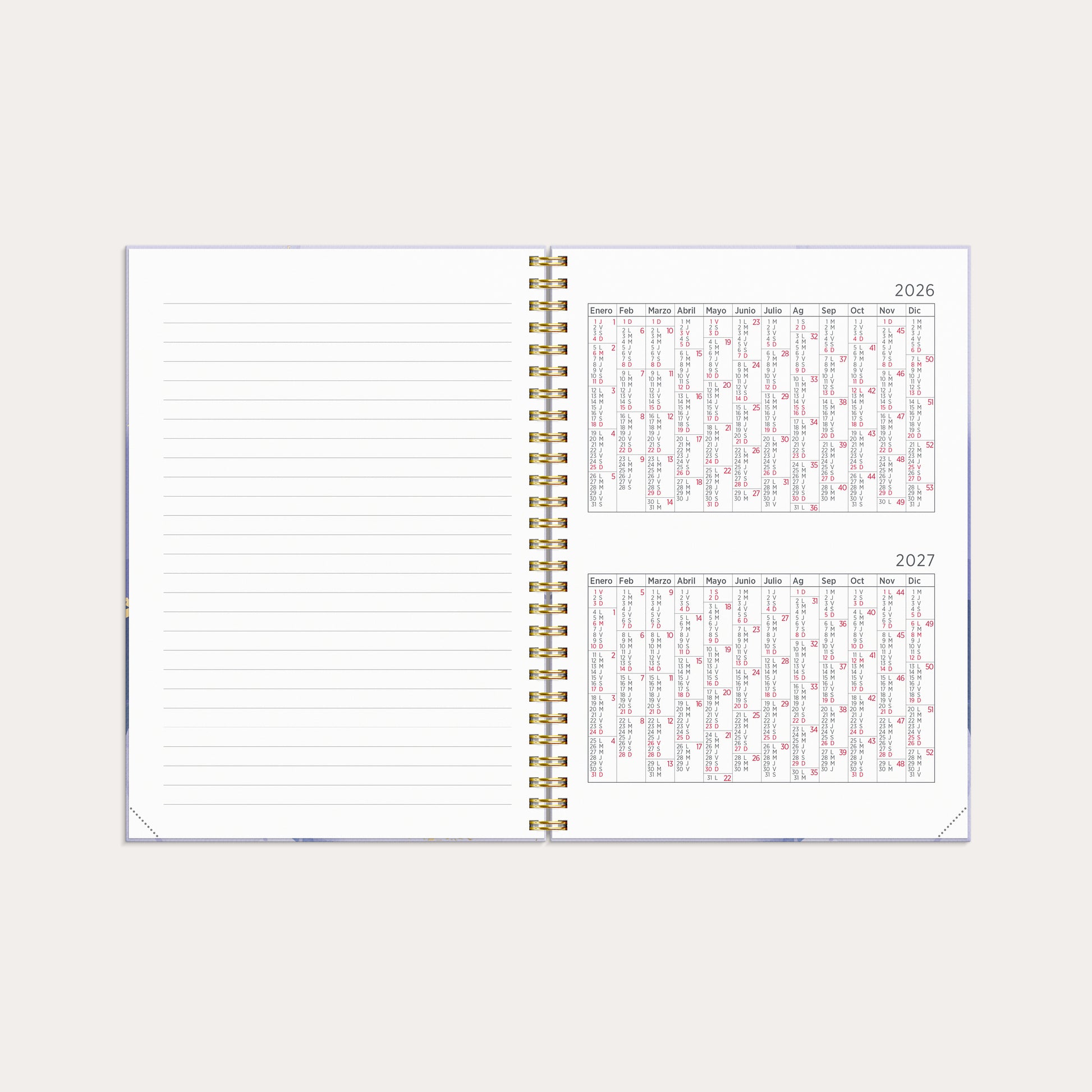 Con un diseño horizontal, ofrece una planificación semanal sencilla y clara, con el mismo espacio para los días laborables que para el fin de semana. La disposición interior es ideal para quienes tienen una agenda apretada y desean un compañero diario que sea tanto práctico como estéticamente atractivo.