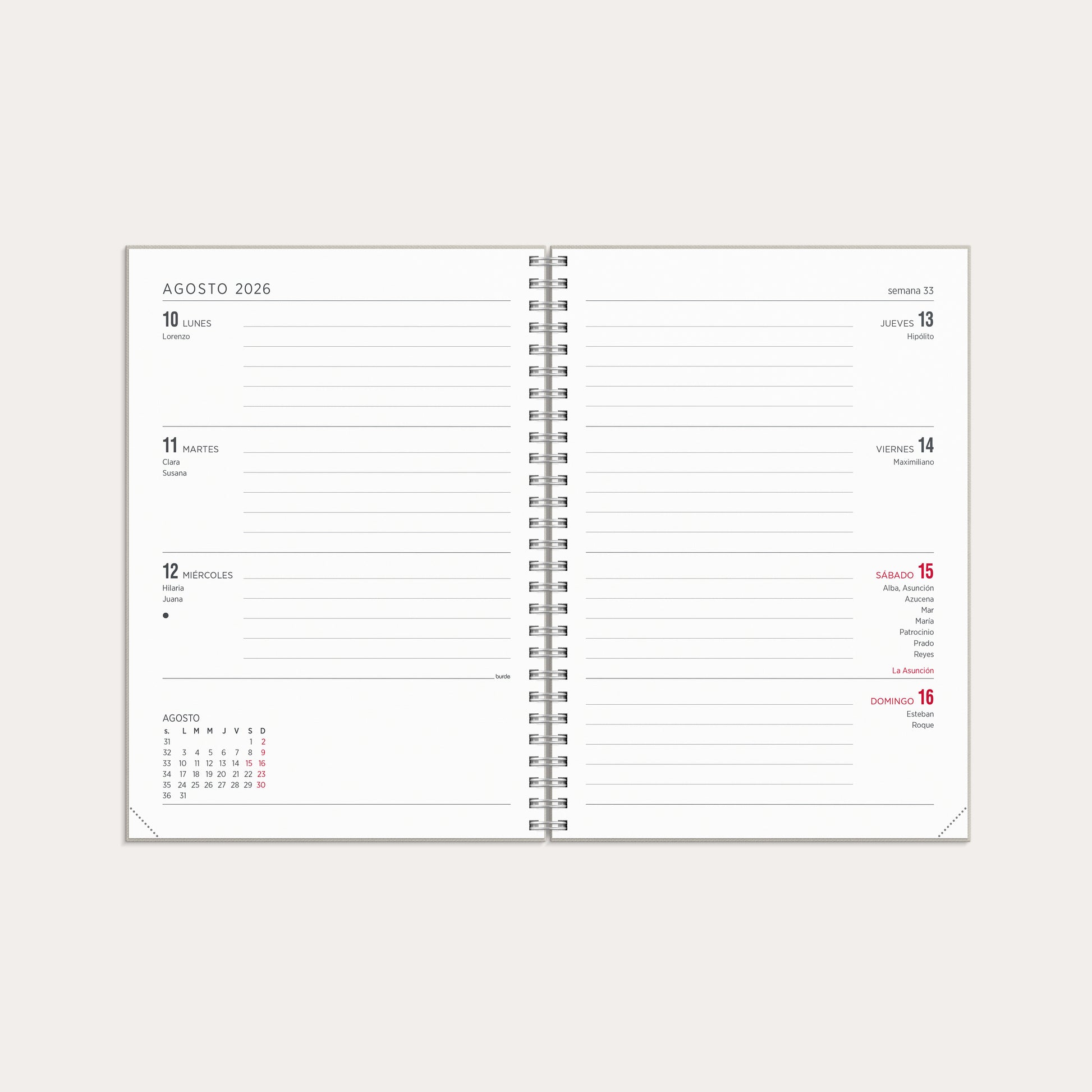 El calendario es pequeño, sencillo y ofrece el mismo espacio para los días laborables que para el fin de semana.