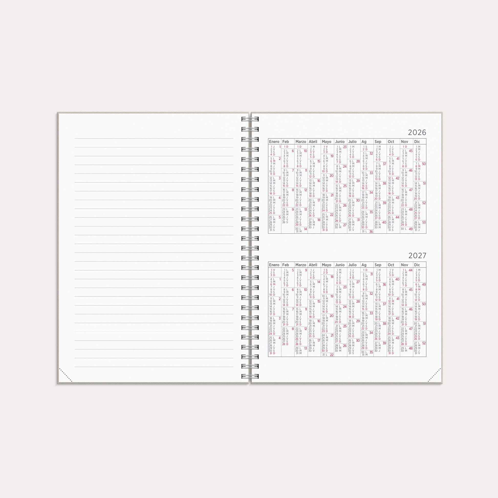 Agenda semanal con una elegante cubierta decorada con un motivo floral. Una práctica doble página en formato horizontal que pone el foco en una planificación semanal clara.
