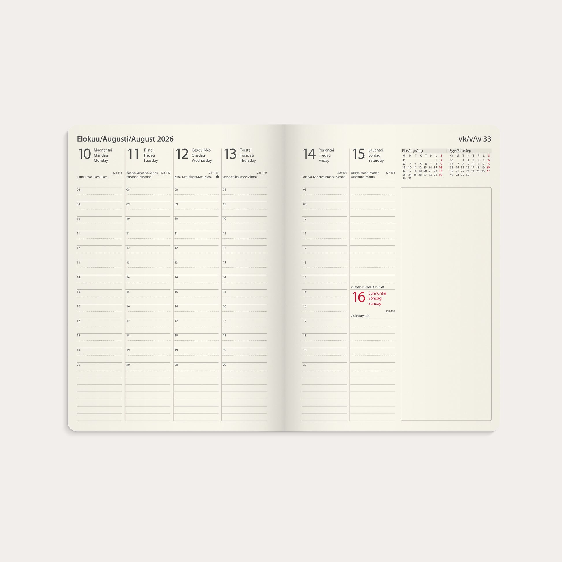 Keinonahkakansi, kuminauhalla. Säilytystasku takakannessa. Kalenterin aukeamalla yksi viikko, tuntijaotus 08-20, palsta muistiinpanoille, kuluvan ja seuraavan kuukauden kalenteritaulukot. Kalenteri sisältää nimipäivät, juhlapyhät, liputuspäivät, kuun vaiheet, vuosisuunnitelmat kuluvalle ja seuraavalle vuodelle ja runsaasti muistiinpanosivuja. Kalenteriosa: vk 52 2025-vk 53 2026/2027. Kolmikielinen: suomi/ruotsi/englanti. Sidottu. Kermanvärinen paperi. FSC®-paperi. Koko: 148x210 mm (A5).
