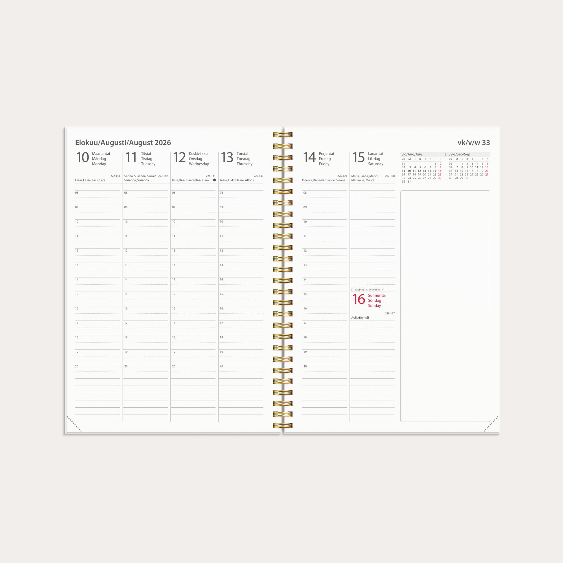 Kartonkikansi kultapainatuksella, kuminauhalla. Kalenterin aukeamalla yksi viikko, tuntijaotus 08-20, palsta muistiinpanoille, kuluvan ja seuraavan kuukauden kalenteritaulukot. Kalenteri sisältää nimipäivät, juhlapyhät, liputuspäivät, kuun vaiheet, vuosisuunnitelmat kuluvalle ja seuraavalle vuodelle, vuosiruudukot edelliselle, kuluvalle ja kahdelle seuraavalle vuodelle, kalendaariset tiedot, auringon nousu- ja laskuajat, yleiset pyhäpäivät maailmalla ja muistiinpanosivut. Kalenteriosa: vk 48 2025-vk 53 2026/2027. Kolmikielinen: suomi/ruotsi/englanti. Parikierresidottu. FSC®. Koko: 148x210 mm (A5).