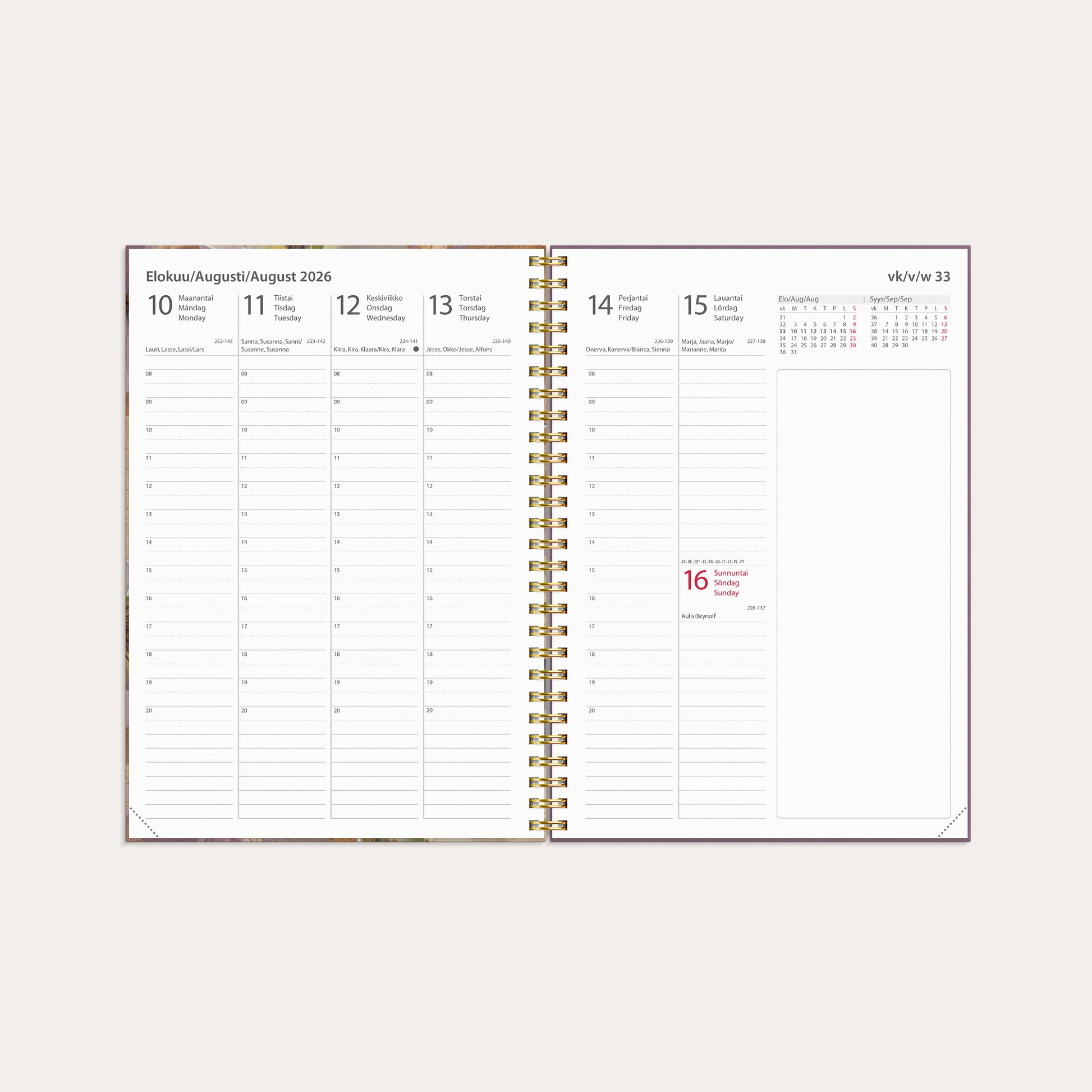 Painettu kartonkikansi. Kalenterin aukeamalla yksi viikko, tuntijaotus 08-20, palsta muistiinpanoille, kuluvan ja seuraavan kuukauden kalenteritaulukot. Kalenteri sisältää nimipäivät, juhlapyhät, liputuspäivät, kuun vaiheet, vuosisuunnitelmat kuluvalle ja seuraavalle vuodelle, vuosiruudukot edelliselle, kuluvalle ja kahdelle seuraavalle vuodelle, kalendaariset tiedot, auringon nousu- ja laskuajat, yleiset pyhäpäivät maailmalla ja muistiinpanosivut. Kalenteriosa: vk 48 2025-vk 53 2026/2027. Kolmikielinen: suomi/ruotsi/englanti. Parikierresidottu. FSC®. Koko: 148x210 mm (A5).