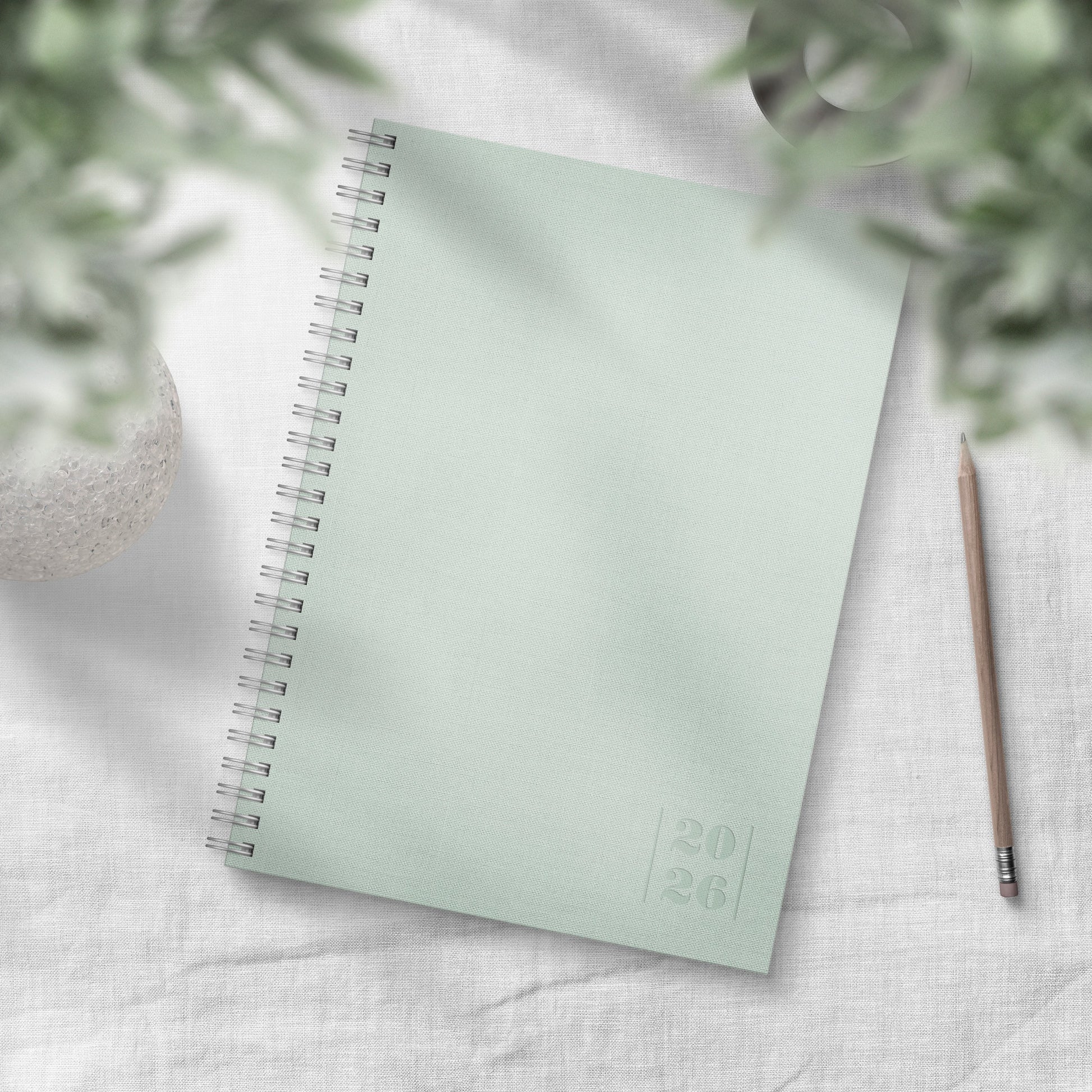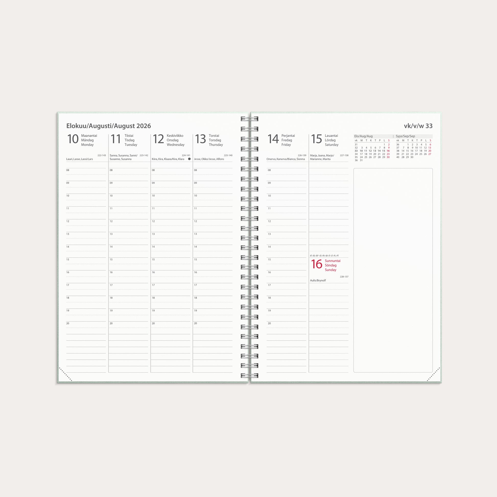 Pellavatekstiilikansi. Kalenterin aukeamalla yksi viikko, tuntijaotus 08-20, palsta muistiinpanoille, kuluvan ja seuraavan kuukauden kalenteritaulukot. Kalenteri sisältää nimipäivät, juhlapyhät, liputuspäivät, kuun vaiheet, vuosisuunnitelmat kuluvalle ja seuraavalle vuodelle, vuosiruudukot edelliselle, kuluvalle ja kahdelle seuraavalle vuodelle, kalendaariset tiedot, auringon nousu- ja laskuajat, yleiset pyhäpäivät maailmalla ja muistiinpanosivut. Kalenteriosa: vk 48 2025-vk 53 2026/2027. Kolmikielinen: suomi/ruotsi/englanti. Parikierresidottu. FSC®. Koko: 148x210 mm (A5).