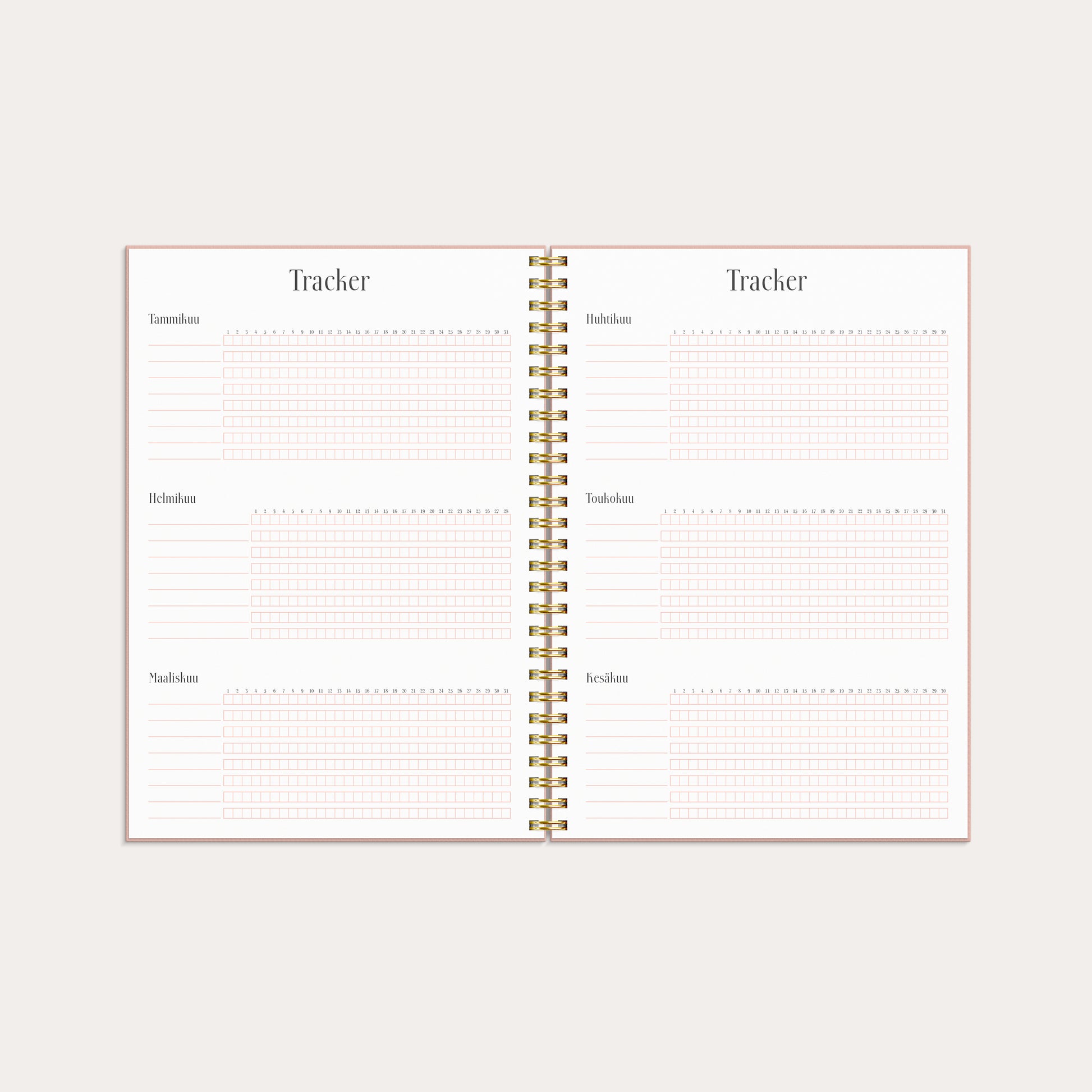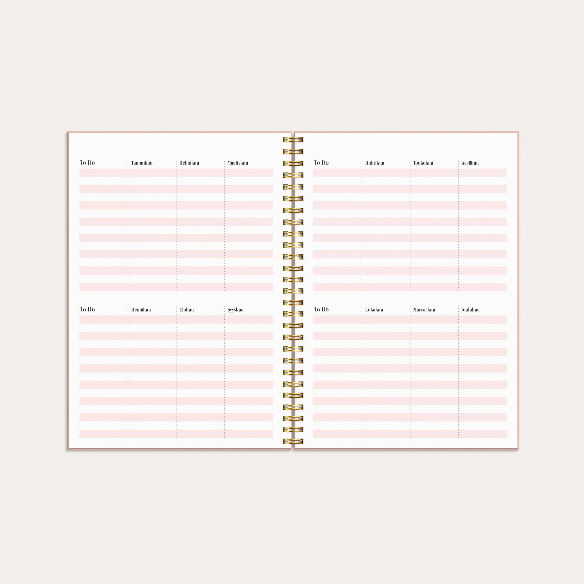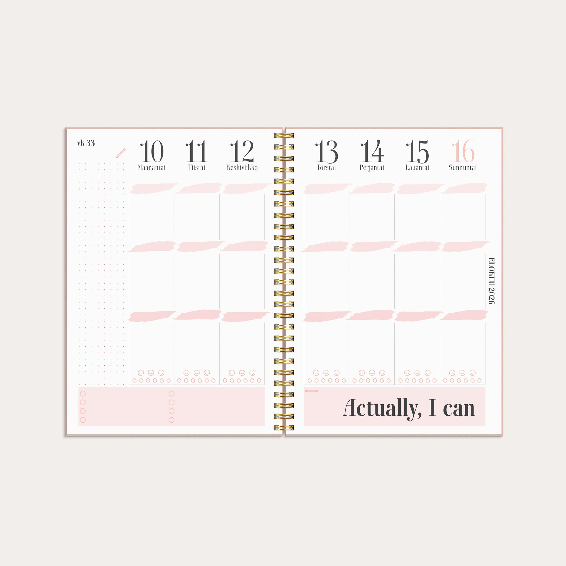 Hyvällä suunnittelulla voit viedä ideasi askeleen lähemmäksi todellisuutta. Life Planner Pink on ihana kalenteri, johon suunnittelet tehtäväsi jotta aikaa jää myös tärkeille asioille. Viikko- ja kuukausisuunnittelun, tehtävälistojen sekä inspiroivien mietelauseiden lisäksi kalenteri sisältää myös työkaluja joilla pidät kirjaa voinnistasi. Anna Life Planner Pinkin tulla osaksi jokapäiväistä elämääsi ja tunne stressin vähenevän, koska kaikki on koottu yhteen ja samaan paikkaan! Painettu kartonkikansi, kuminauhalla. Kalenteri sisältää juhlapyhät, liputuspäivät, vuosisuunnitelma kuluvalle vuodelle, vuosiruudukot kuluvalle ja seuraavalle vuodelle. Suunnitteluluettelot. Paperitasku ja siirrettävät muoviset kirjamerkit. Kalenteriosa: vk 51 2025-vk 53 2026/2027. Suomenkielinen. Parikierresidottu. FSC®. Koko: 148x210 mm (A5).