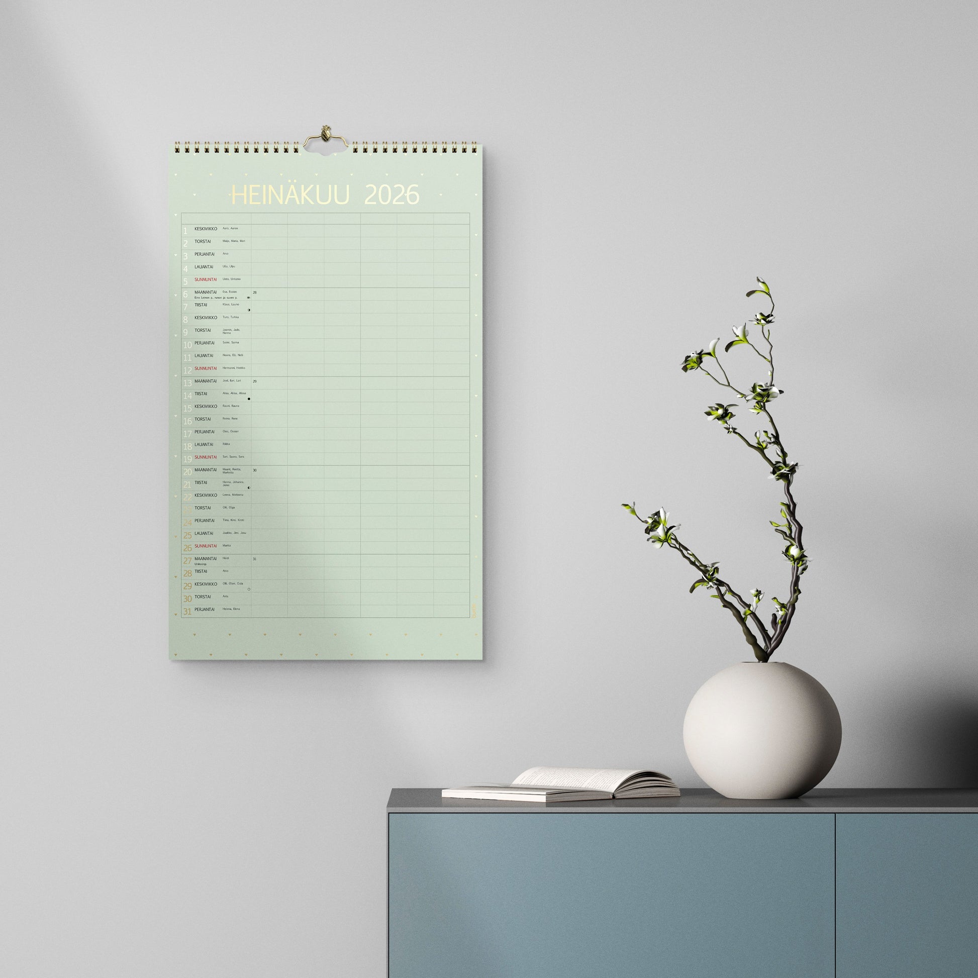 Seinäkalenteri pastellinvärisillä sivuilla ja kultapainatuksella. Jokaisella aukeamalla yksi kuukausi ja kuusi saraketta. Kalenteri sisältää nimipäivät, liputuspäivät, juhlapyhät ja kuun vaiheet. Suomenkielinen. Parikierresidottu. FSC®. Koko: 250x410 mm.