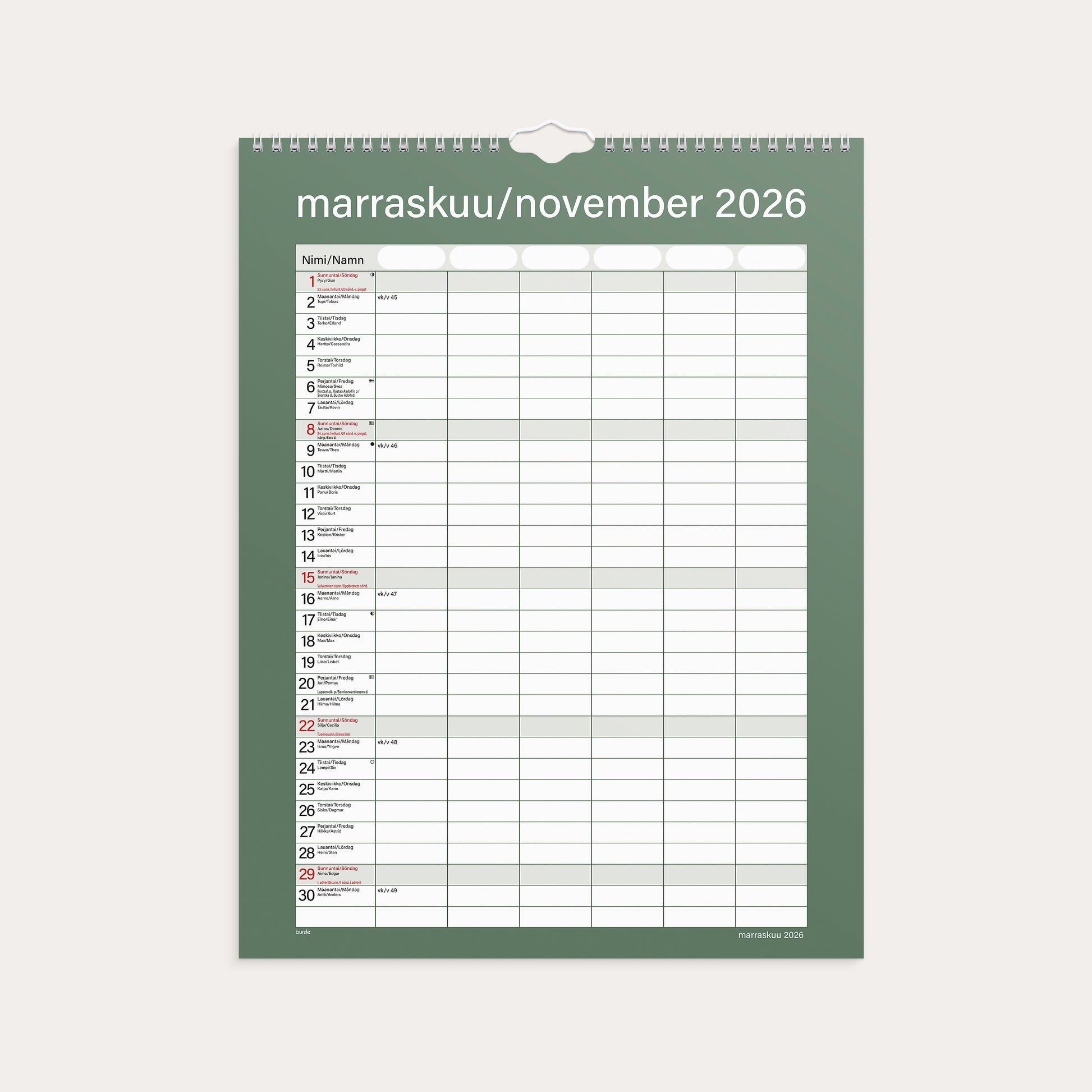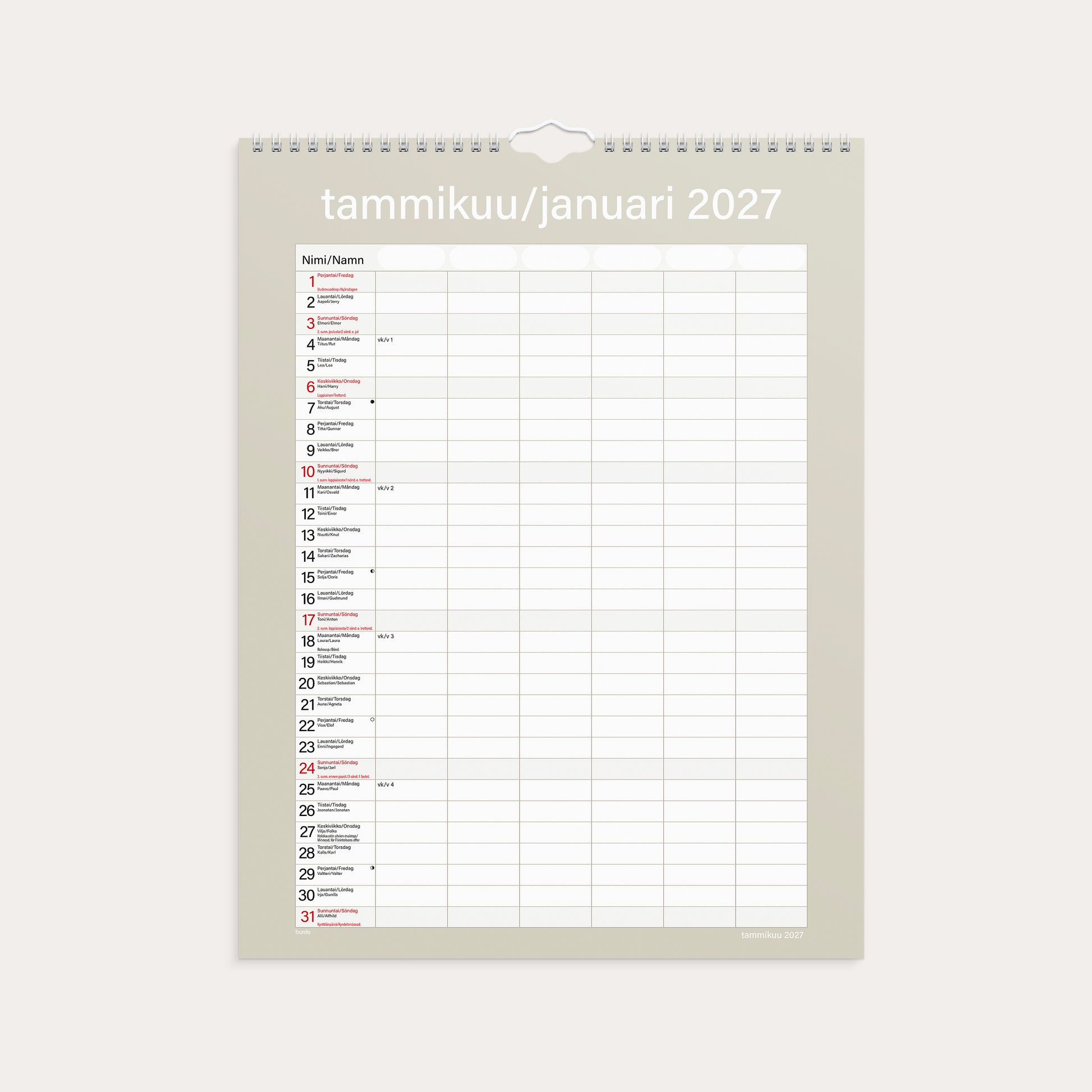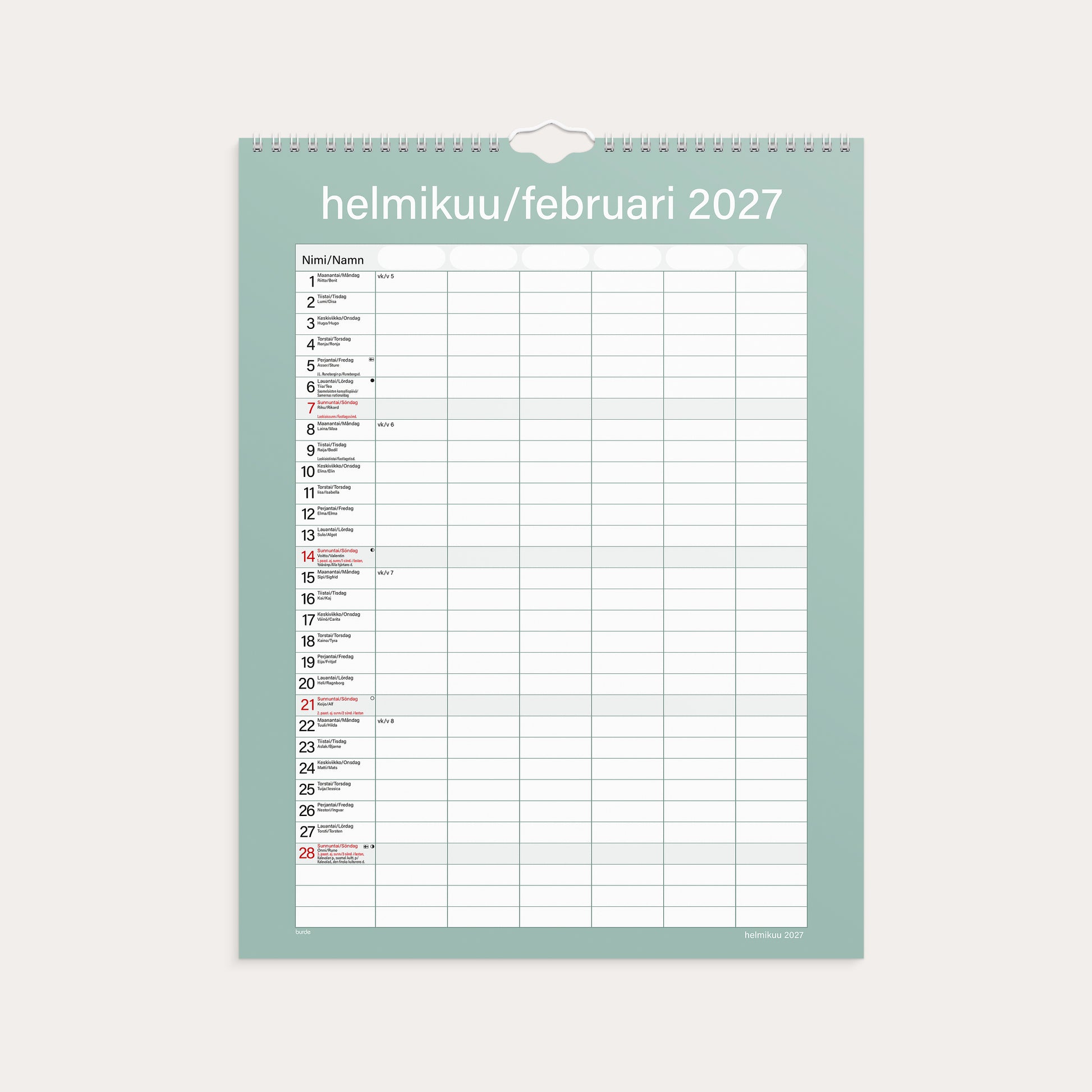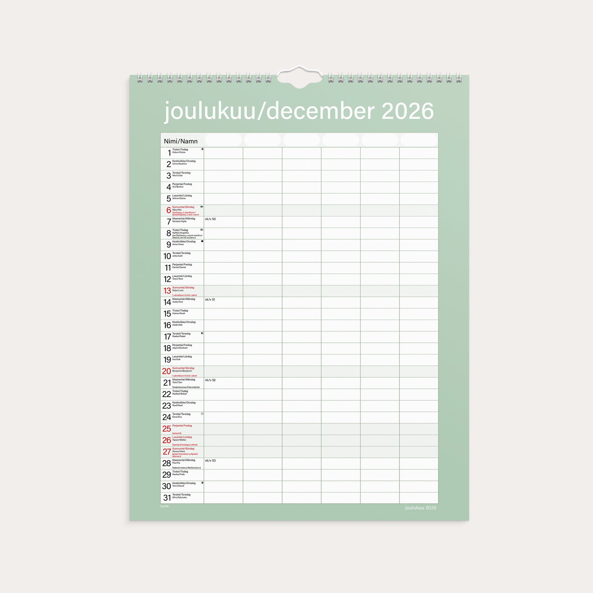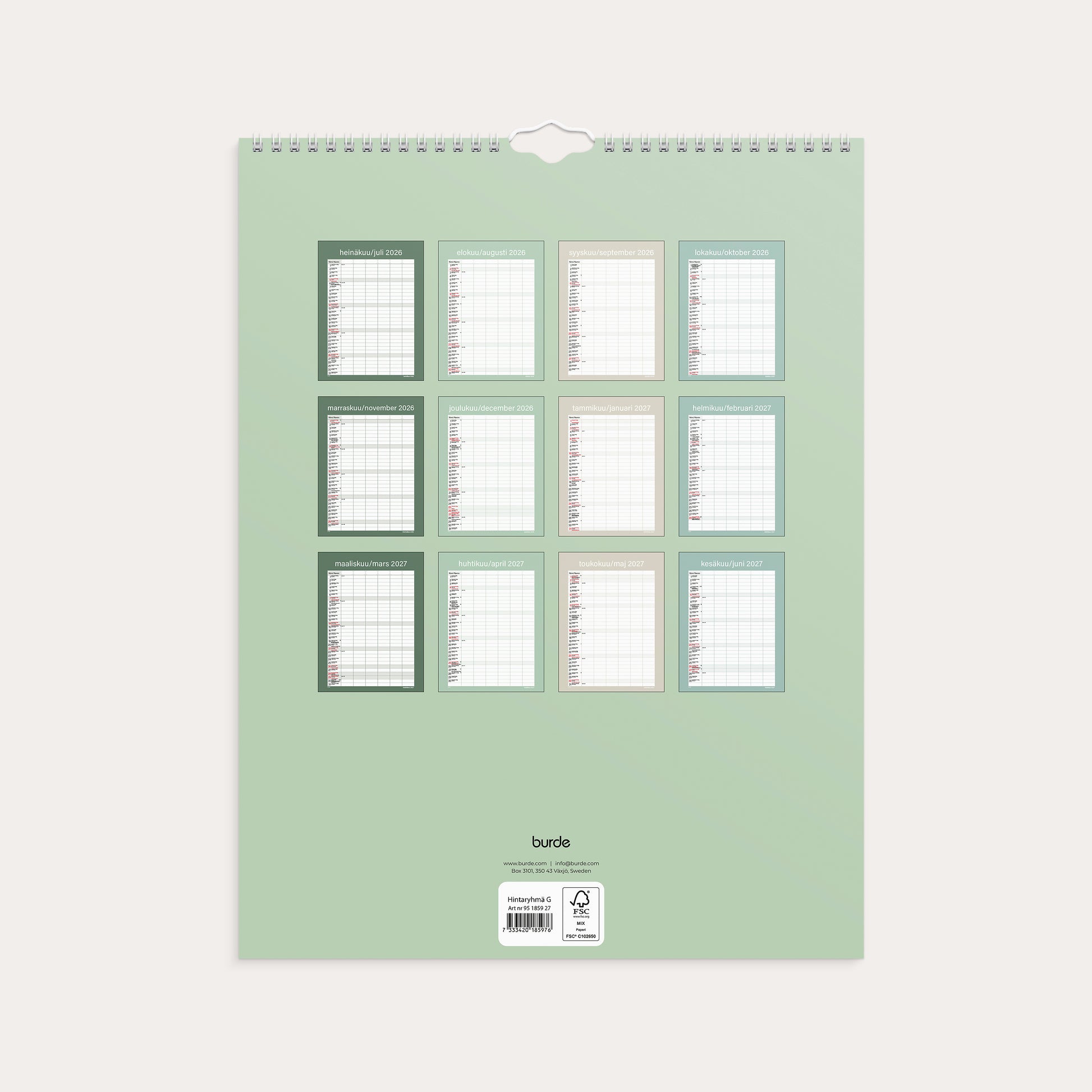 Yksinkertainen perhekalenteri kuudella sarakkeella. Kalenteri sisältää nimipäivät, liputuspäivät, kansalliset pyhäpäivät ja kuun vaiheet. Kalenteriosa: heinäkuu 2026 - kesäkuu 2027. Kaksikielinen: suomi/ruotsi. Parikierresidottu. FSC®.