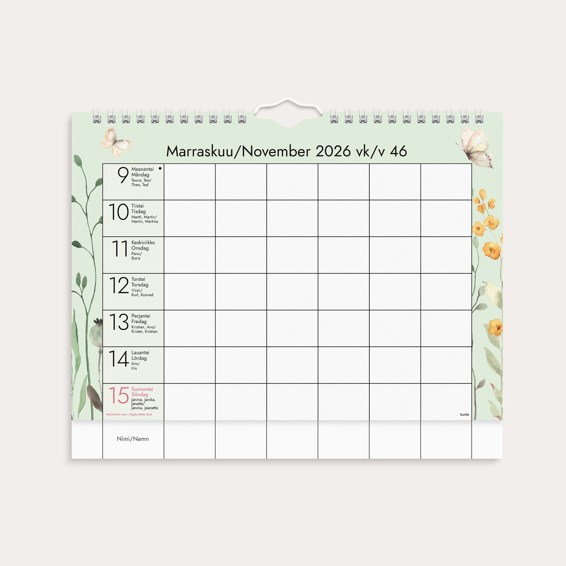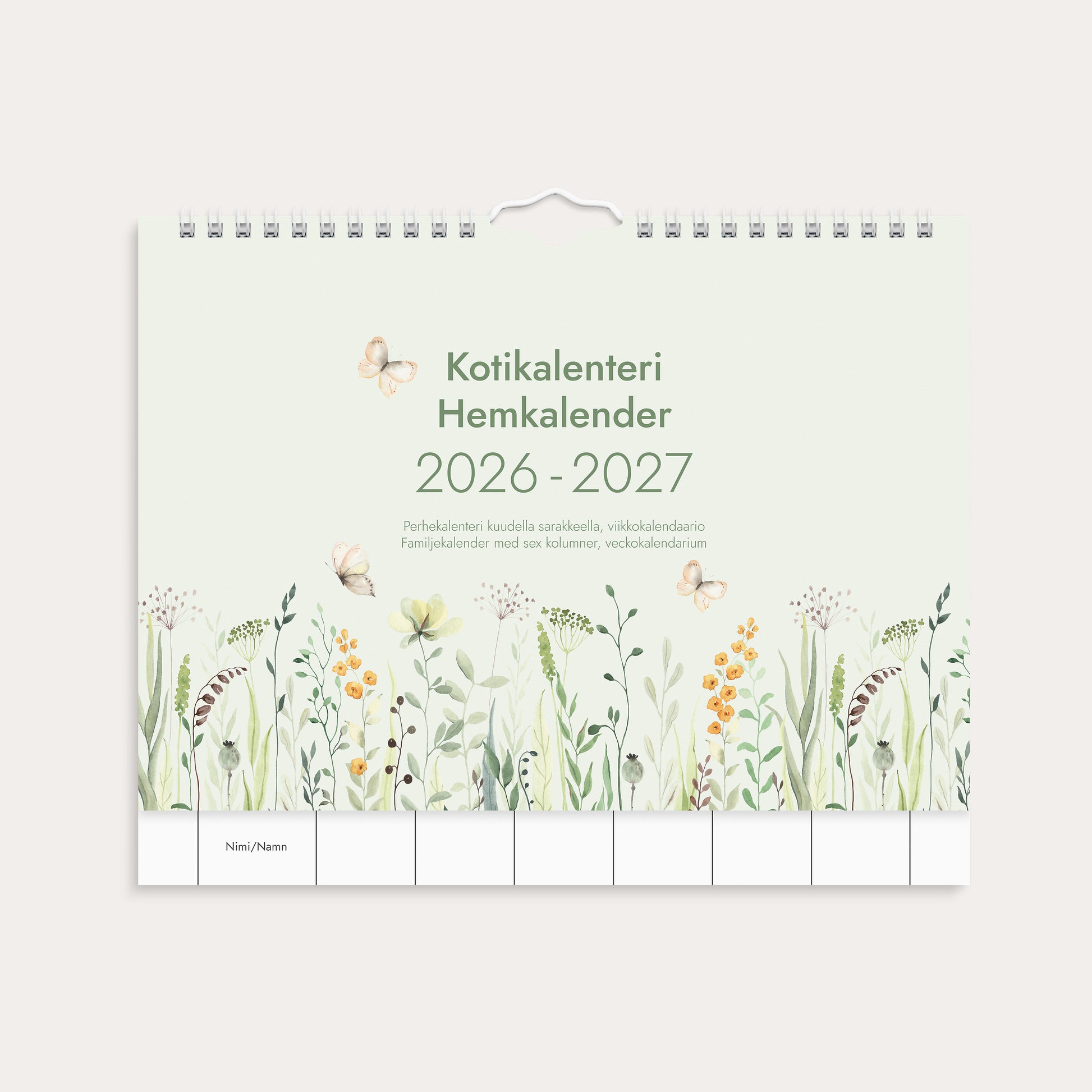Perhekalenteri kuudella sarakkeella, johon voi kirjata koko perheen menemiset. Aukeamalla yksi viikko. Kalenteri sisältää nimipäivät, liputuspäivät, kansalliset pyhäpäivät ja kuun vaiheet. Kalenteriosa: vk 28 2026 - vk 27 2027. Kaksikielinen: suomi/ruotsi. Parikierresidottu. FSC®.
