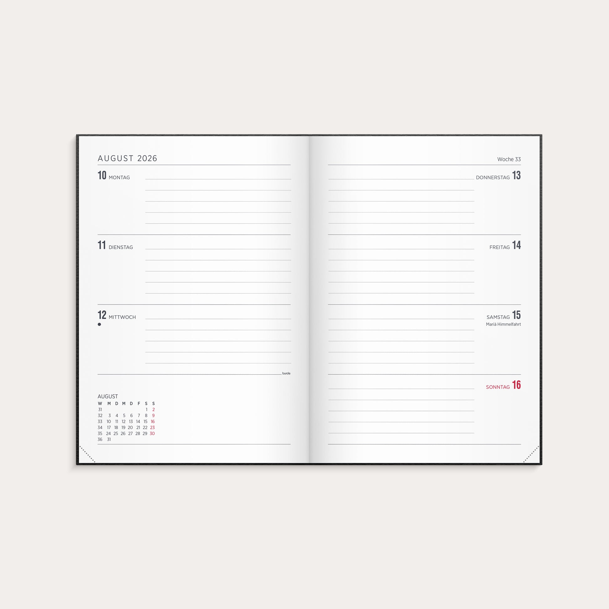 Senator A5 bietet ein klassisches Wochenlayout im horizontalen Format, das sich auf eine einfache Wochenplanung konzentriert. Mit einer Jahresübersicht und Jahresplanung ist der Senator A5 ein ideales Werkzeug für dich, wenn du viel auf dem Programm hast oder als analoges Ergänzungsmittel zu deinen digitalen Lösungen. Zusätzlich enthält er Checklisten, kleinere Notizmöglichkeiten und eine praktische Aufbewahrungstasche.