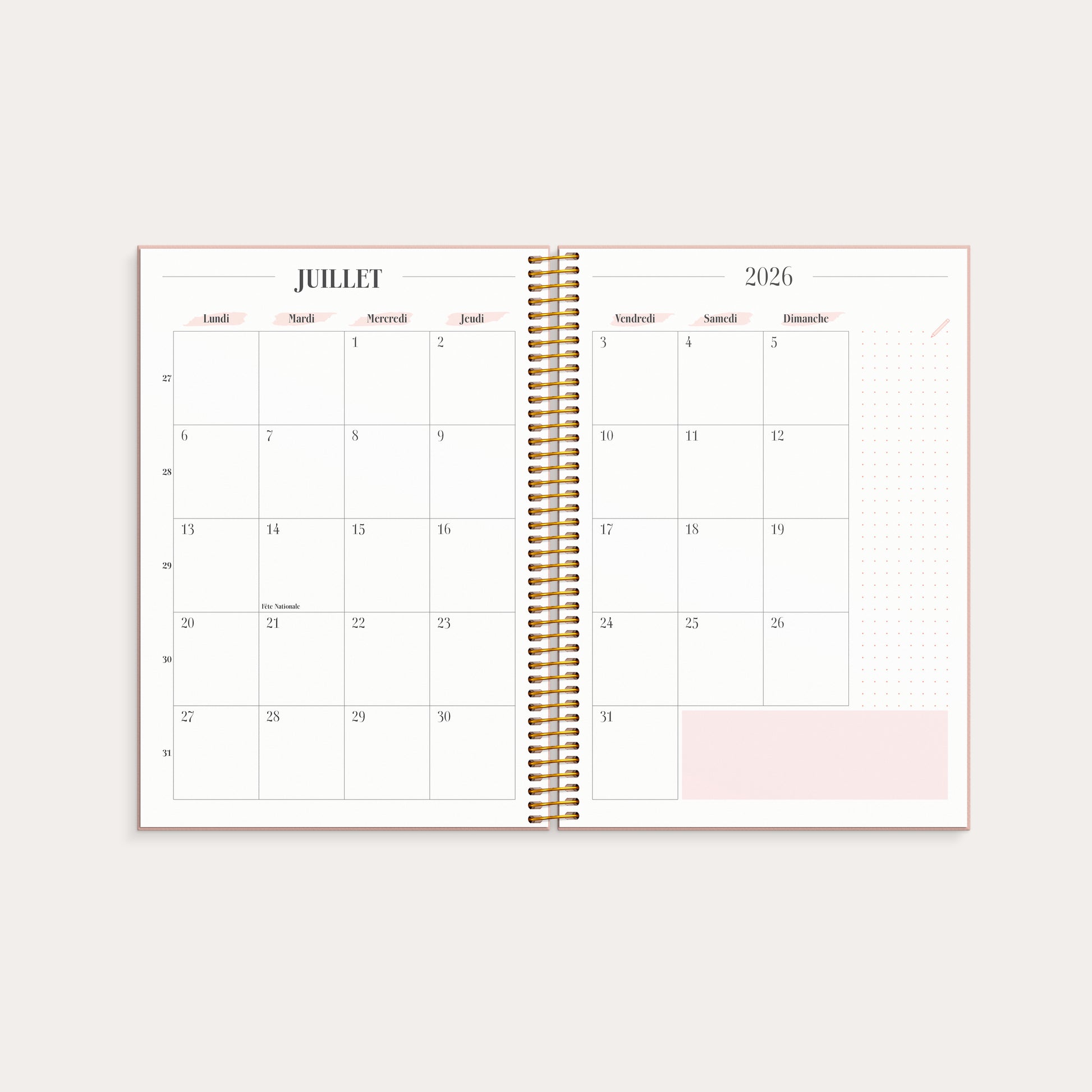 Organisez vos journées en utilisant les trois sections : matinée, après-midi, et soirée. Les pages lignées sont idéales pour vos listes de choses à faire et vos notes, tandis que les pages avec des pointillés vous offrent la liberté de créer des dessins ou un bullet journal.