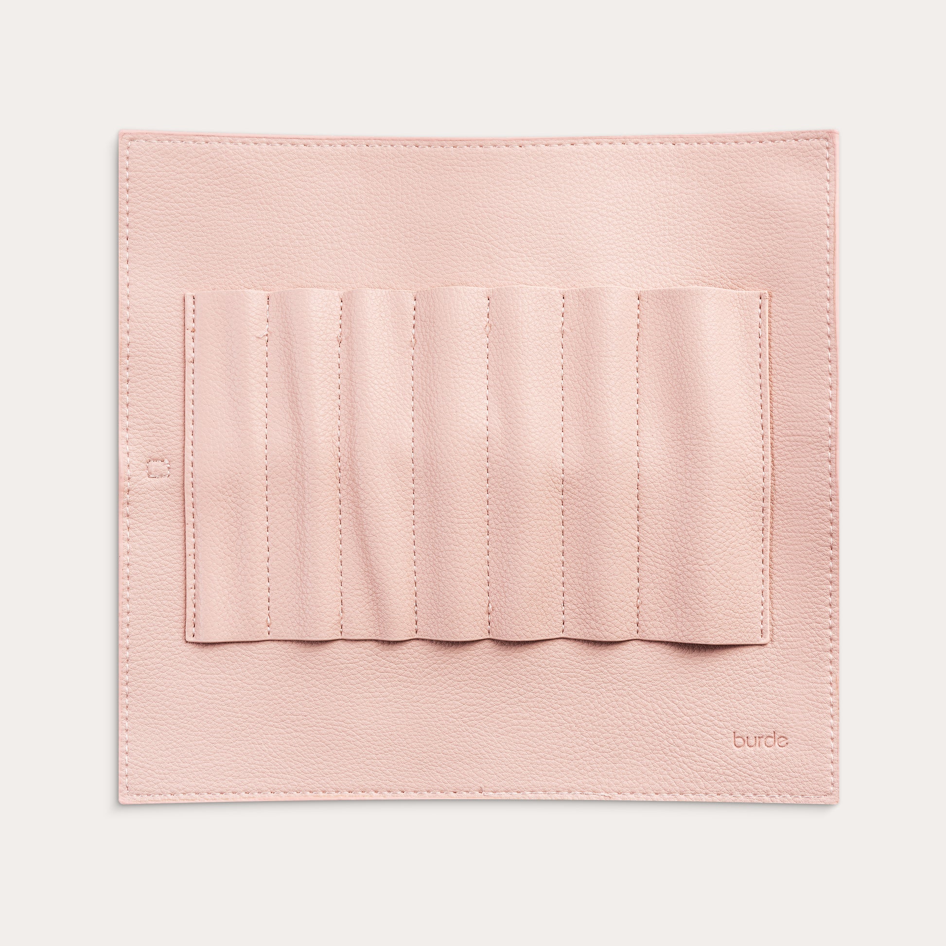 Pencil case in soft faux leather with drawstring. The pencil case has room for 6 standard sized pens and then a larger pocket for wider pens, brushes or erasers.