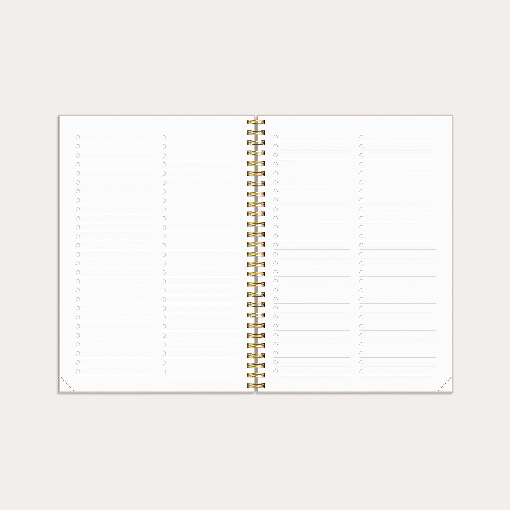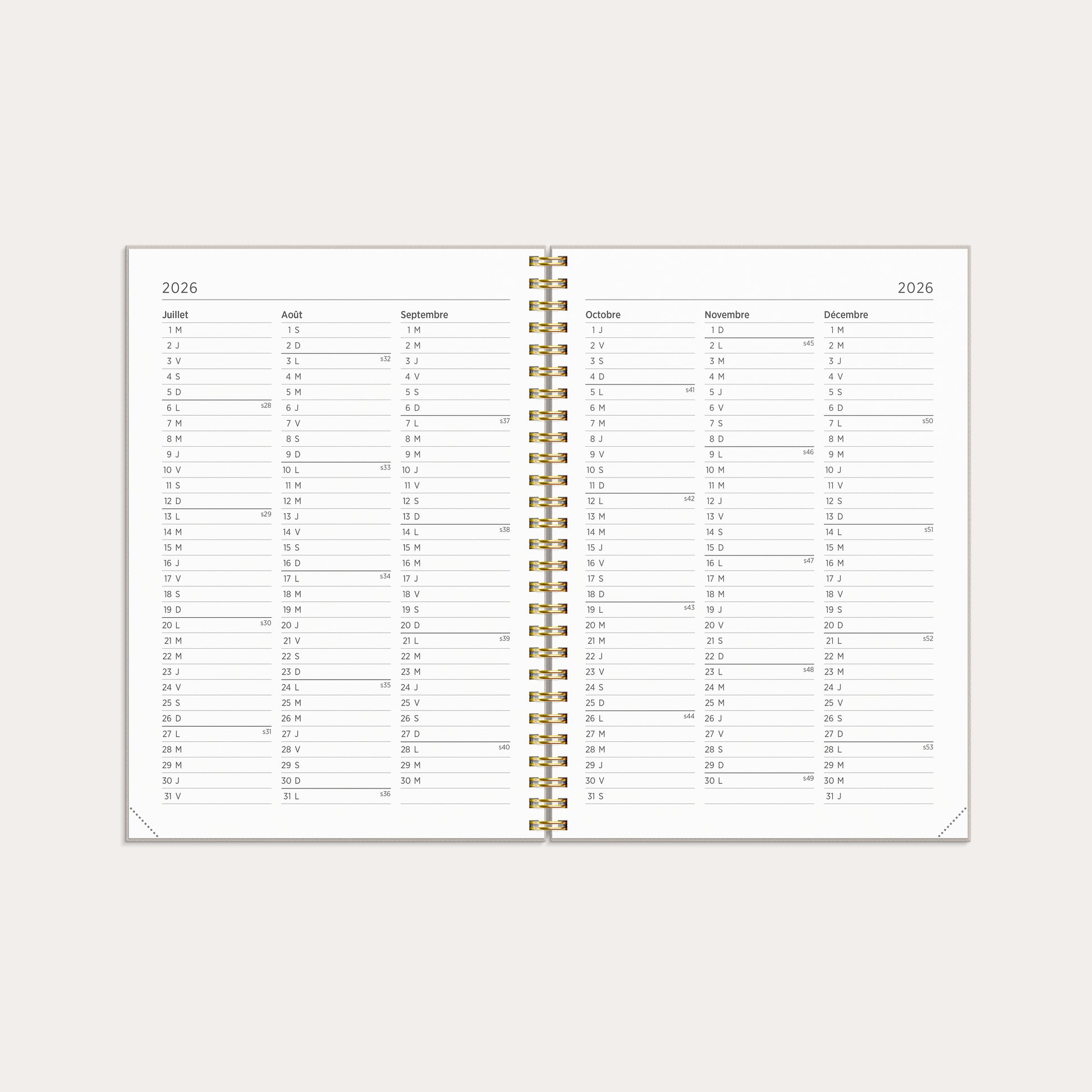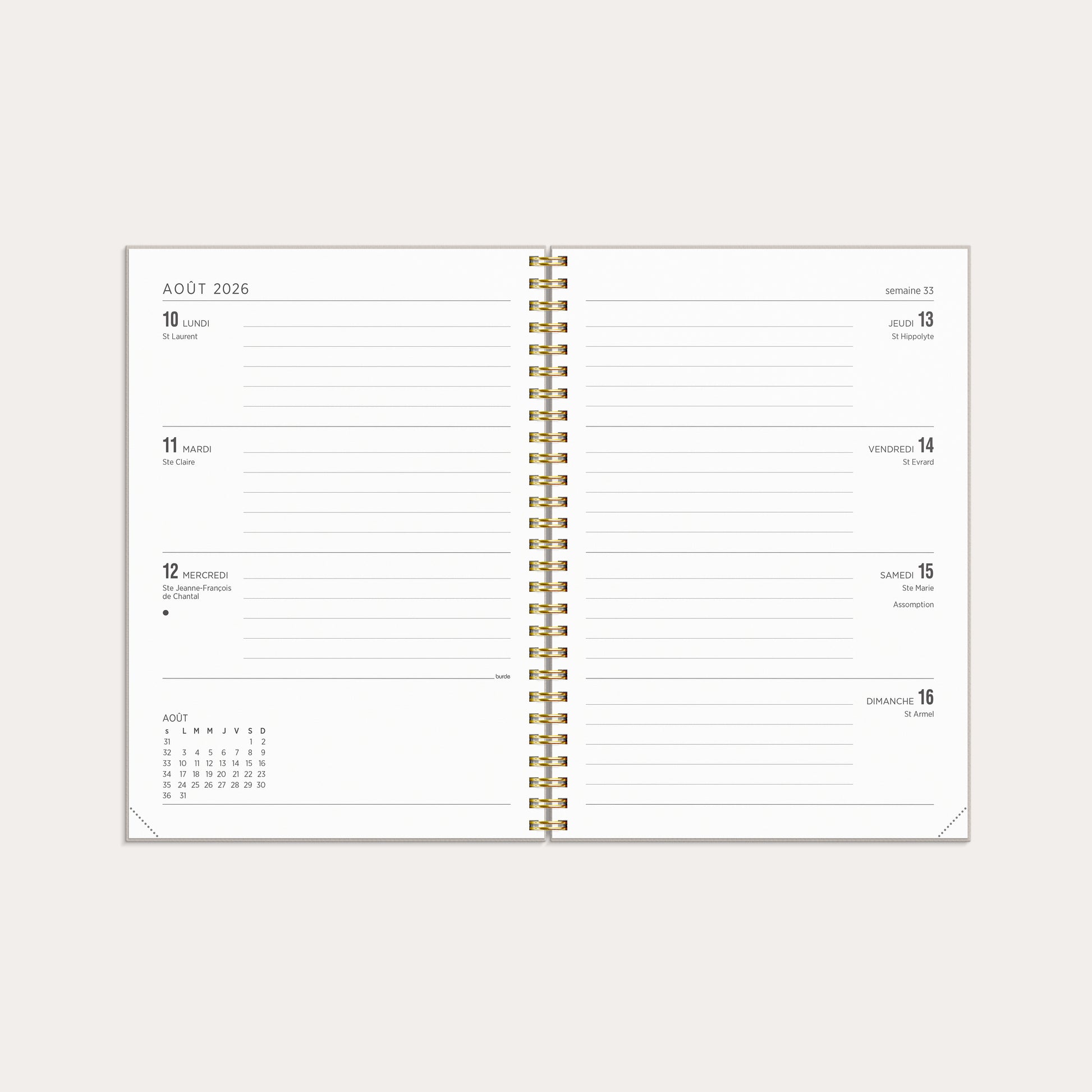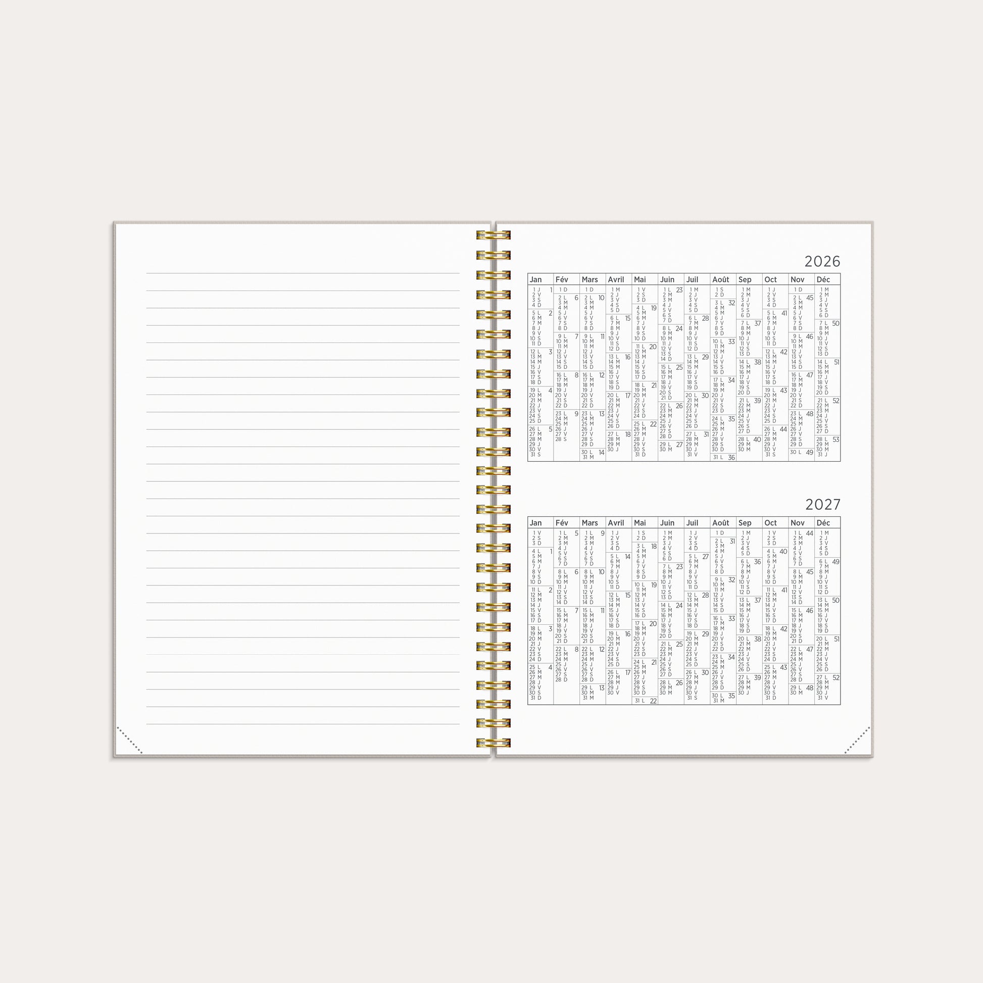 Un calendrier élégant avec une couverture en carton structuré. Avec une mise en page horizontale, il offre une planification hebdomadaire simple et claire, avec autant d’espace pour les jours de semaine que pour le week-end. La disposition intérieure est idéale pour ceux qui ont un emploi du temps chargé et souhaitent avoir un compagnon de tous les jours à la fois pratique et esthétique.