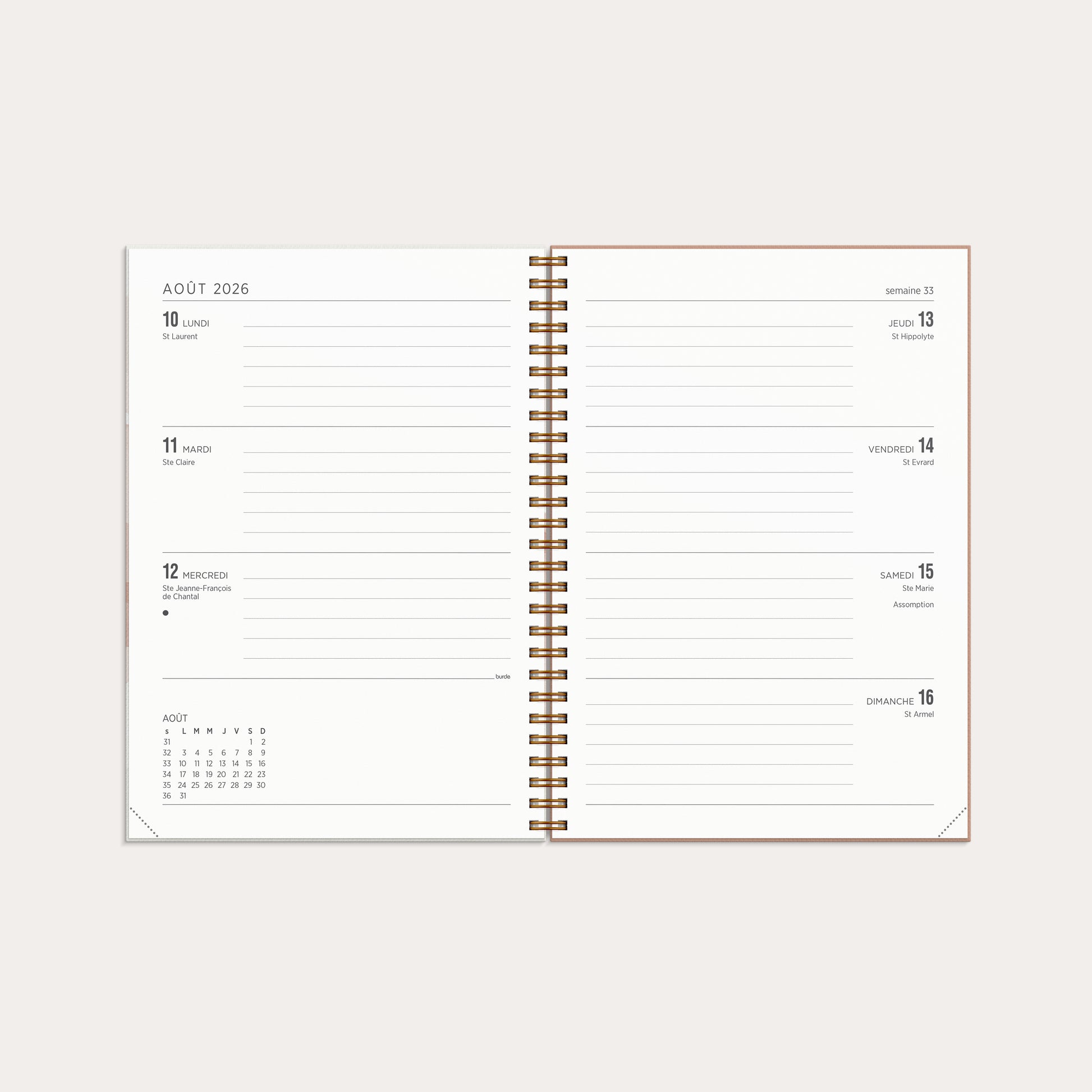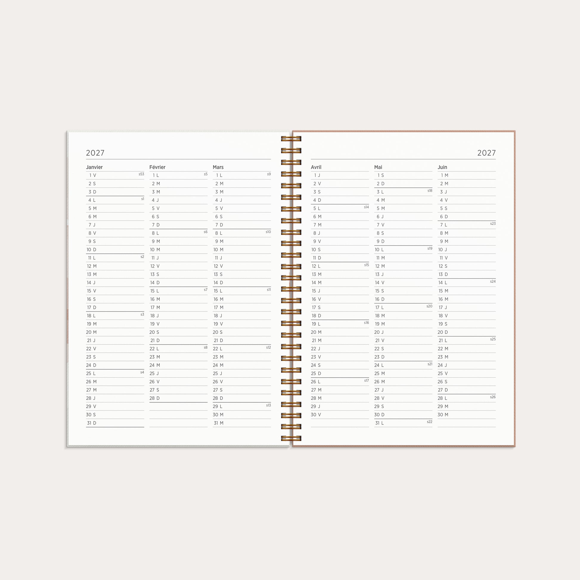 Un calendrier avec une couverture en carton recyclé et un marquage doré. Le calendrier propose une double page en format paysage, mettant l’accent sur une planification hebdomadaire claire. La mise en page intérieure convient parfaitement à ceux qui ont un emploi du temps chargé, quel que soit le jour de la semaine. Le calendrier est simple et clair, offrant autant d’espace pour les jours de semaine que pour le week-end.