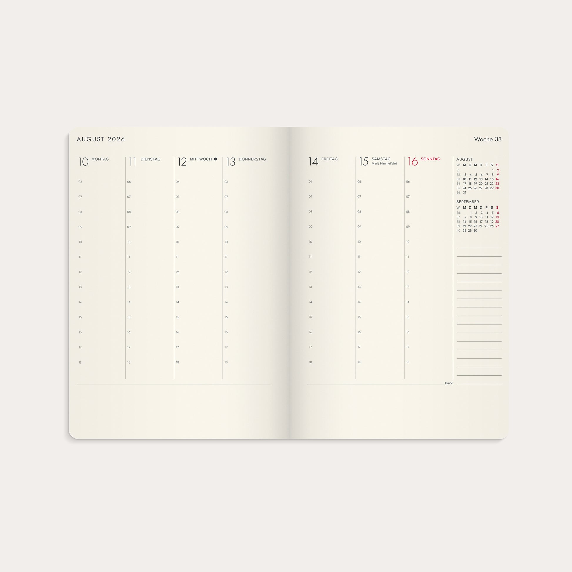Agency Forma Deluxe ist ein gebundener Kalender mit cremefarbenem Papier, der dank seiner einzigartigen Bindungstechnik flach auf der Tischoberfläche liegt, wenn du schreibst. Der Kalender bietet eine Woche pro Seite, eine vertikale Layout mit Stundenaufteilung von 06-18 und eine Notizfläche am unteren Rand jeder Seite für weiterführende Reflexionen.