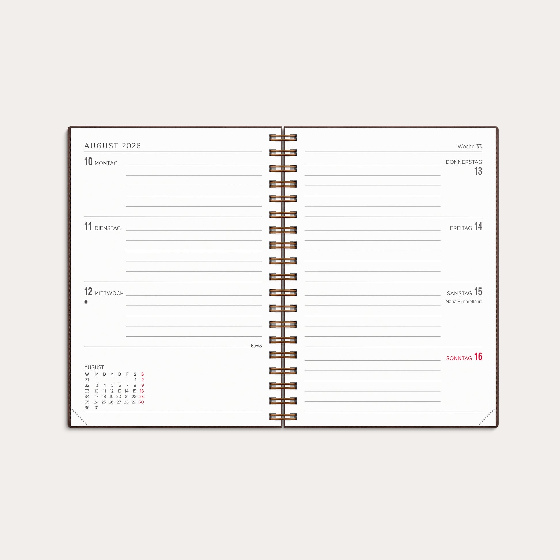 Das Cover Twist besteht aus samtweichem Kunstleder und verfügt über eine nützliche Lasche, die als Lesezeichen dient, um dich einfach durch die Kalenderseiten zu navigieren.