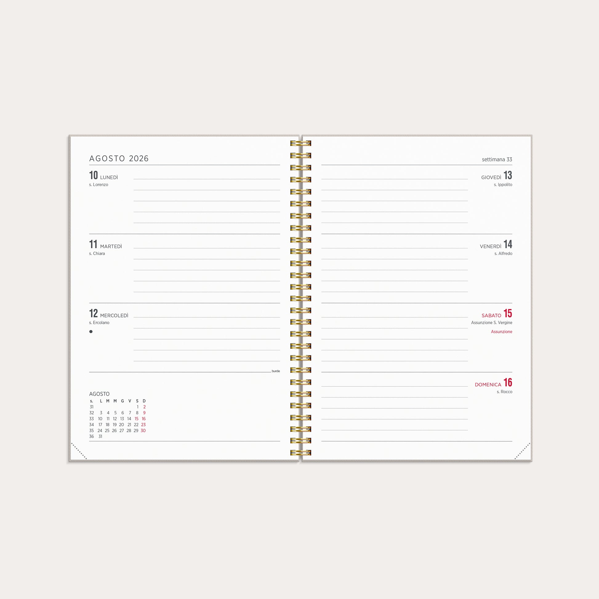 Con un layout orizzontale, offre una pianificazione settimanale semplice e chiara, con lo stesso spazio dedicato ai giorni feriali e al fine settimana. La disposizione interna è ideale per chi ha un’agenda fitta di impegni e desidera un compagno quotidiano che sia al tempo stesso pratico ed esteticamente gradevole.