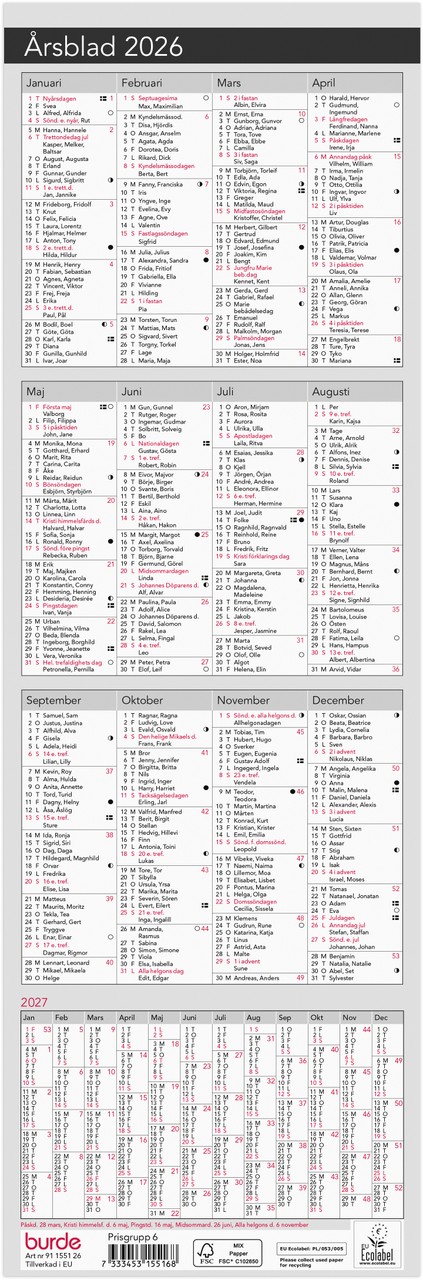 Mått: 365 x 120 x 1 mm. Layout: År/blad. Kalendarium: 2026-01-01 – 2026-12-31. Innehåll: Kyrkliga helgdagar, flaggdagar, helgdagar, månfaser, namnsdagar, årsöversikter föregående, innevarande och de tre följande åren. Antal sidor: 2. Miljöinformation: FSC®. Ecolabel.