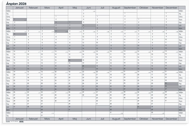 Mått: 890 x 590 x 4 mm. Layout: År/blad. Kalendarium: 2026-01-01 – 2026-12-31. Innehåll: Helgdagar, årsplan/årsplaner. Antal sidor: 1.