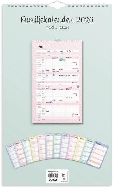Mått: 425 x 250 x 8 mm. Layout: Månad/blad. Kalendarium: 2026-01-01 – 2026-12-31. Spiralbunden. Innehåll: Flaggdagar, helgdagar/aftnar, månfaser, namnsdagar, temadagar/händelser, årsöversikt/årsöversikter, 5 kolumner, stickersark. Antal sidor: 12. Miljöinformation: FSC®.