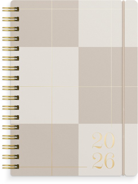 En kalender med ett omslag i återvunnen kartong och guldprägling. Ett praktiskt uppslag med liggande layout där fokus ligger på tydlig veckoplanering. Inlagans layout passar dig som har mycket på gång, oavsett veckodag. Kalendern är liten och enkel och med lika mycket utrymme för både vardag och helg.