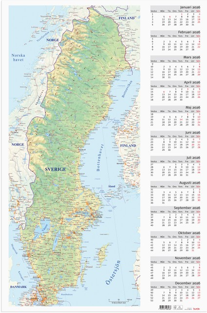 Mått: 590 x 890 x 2 mm. Layout: År/blad. Kalendarium: 2026-01-01 – 2026-12-31. Innehåll: Årsöversikt/årsöversikter. Antal sidor: 2. Miljöinformation: FSC®.