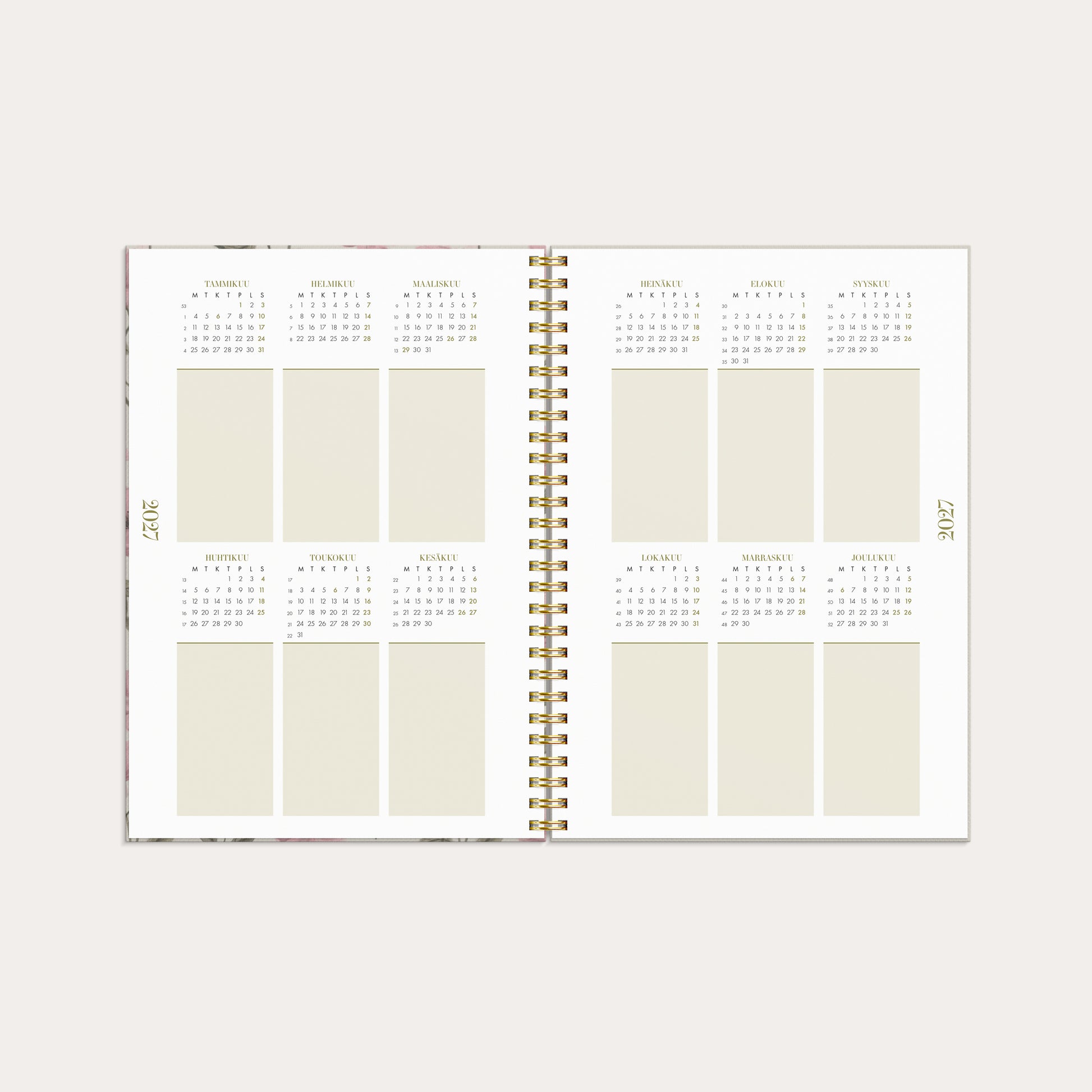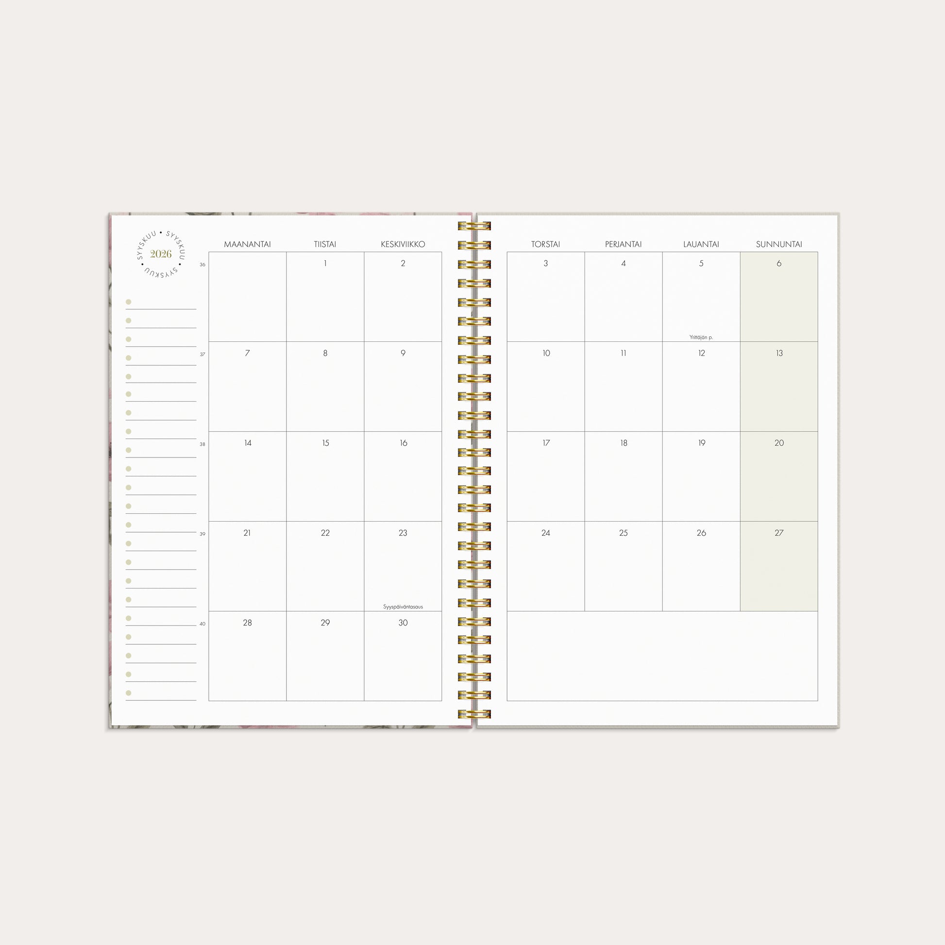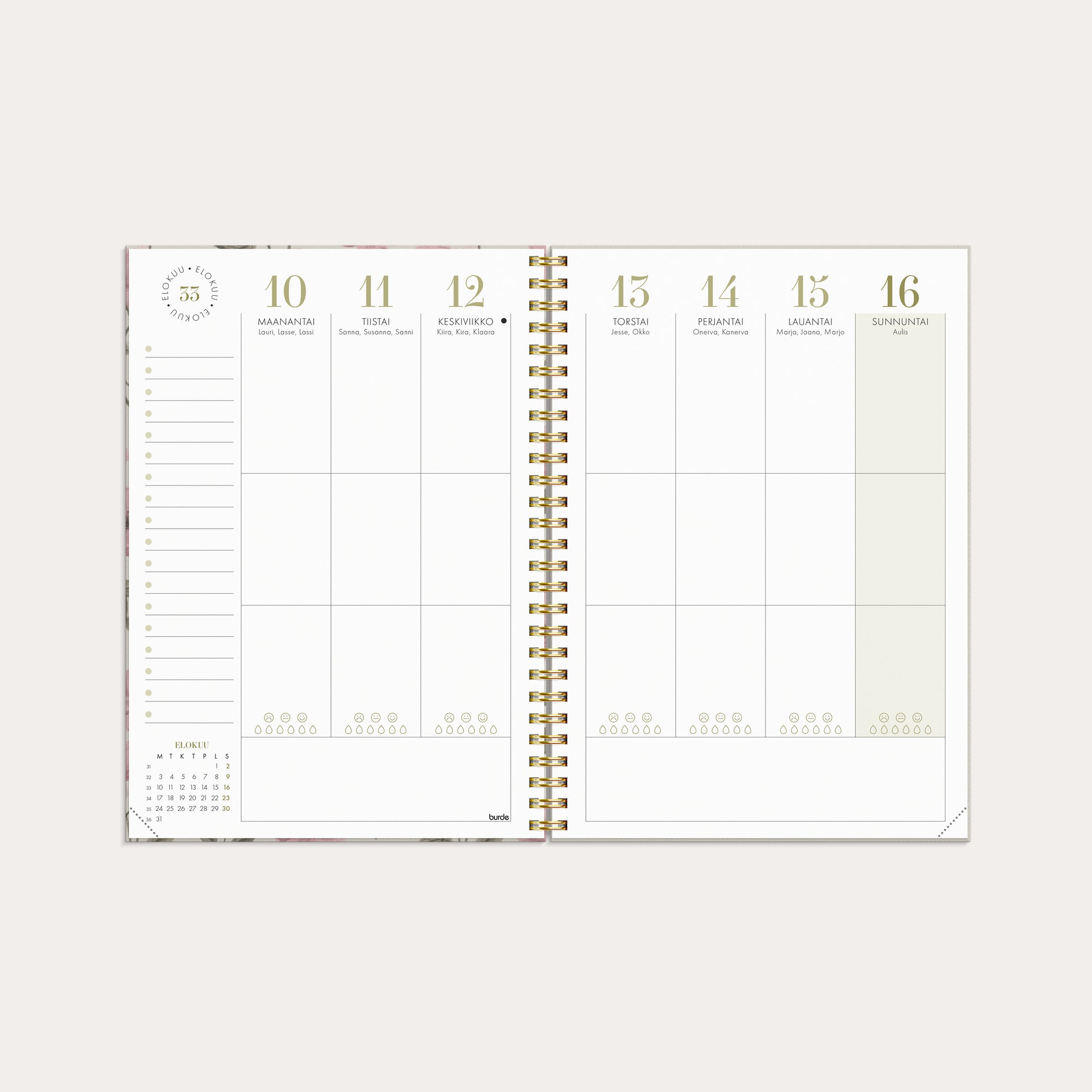 Henkilökohtainen kalenteri, joka keskittyy hyvinvointiisi ja tasapainoosi ja jossa on erilaisia työkaluja viikkosuunnitteluun. Luo oma ainutlaatuinen kalenterisi tarra-arkin avulla ja keskity siihen, mikä tekee sinulle hyvää. Jaa arkipäiväsi kolmeen osaan, kuten työ, liikunta ja tavoitteet tai mikä parhaiten heijastaa elämääsi ja tarpeitasi. Käytä tarkistuslistoja ja muistiinpano-osaa heijastamaan ja keskittymään siihen, mikä tekee sinut onnelliseksi. Painettu kartonkikansi kuminauhalla. Kalenteri sisältää nimipäivät, juhlapyhät, liputuspäivät, kuun vaiheet, vuosiruudukot kuluvalle ja seuraavalle vuodelle ja muistiinpanosivuja. Paperitasku ja siirrettävät paperiset kirjamerkit. Kalenteriosa: vk 51 2025 – v 53 2026/2027. Suomenkielinen. Parikierresidottu. FSC®. Koko: 148x210 mm (A5).