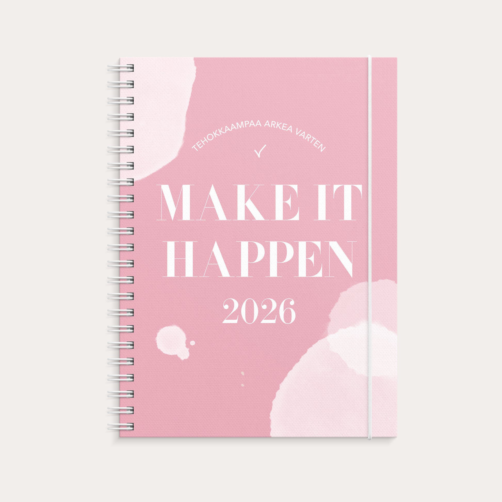 Kun sinulla tapahtuu paljon asioita samanaikaisesti, on helppo unohtaavosa niistä! Kalenteri Make It Happen, auttaa sinua järjestelemään arkeasi ja olemaan tehokas jokapäiväisessä elämässä niin, että sinun ei tarvitse muistaa kaikkea. Jokaisella aukeamalla löytyy listoja, joiden avulla voit suunnitella esimerkiksi ostoksesi, tapaamiset sekä hoidettavat asiat. Kartonkikansi, kuminauhalla. Paperitasku. Kalenterin aukeamalla yksi viikko ja muistilistat. Kalenteri sisältää nimipäivät, juhlapyhät, liputuspäivät, kuun vaiheet, vuosisuunnitelmat kuluvalle vuodelle ja seuraavalle vuodelle, yleiset pyhäpäivät maailmalla, kalendaariset tiedot, auringon nousu- ja laskuajat ja muistiinpanosivut. Kalenteriosa: vk 51 2025-vk 53 2026/2027. Suomenkielinen. Parikierresidottu. FSC®. Koko: 148x210 mm (A5).