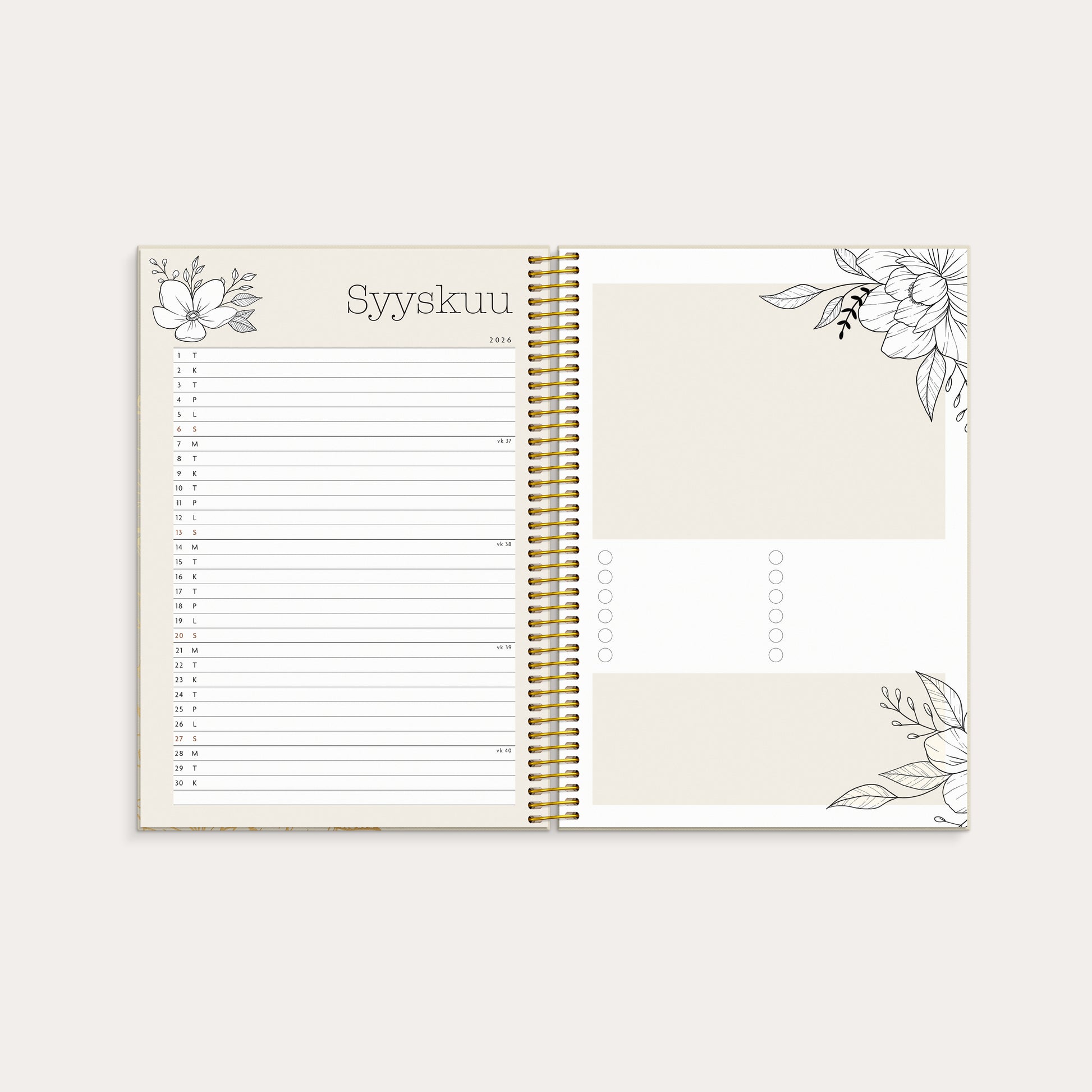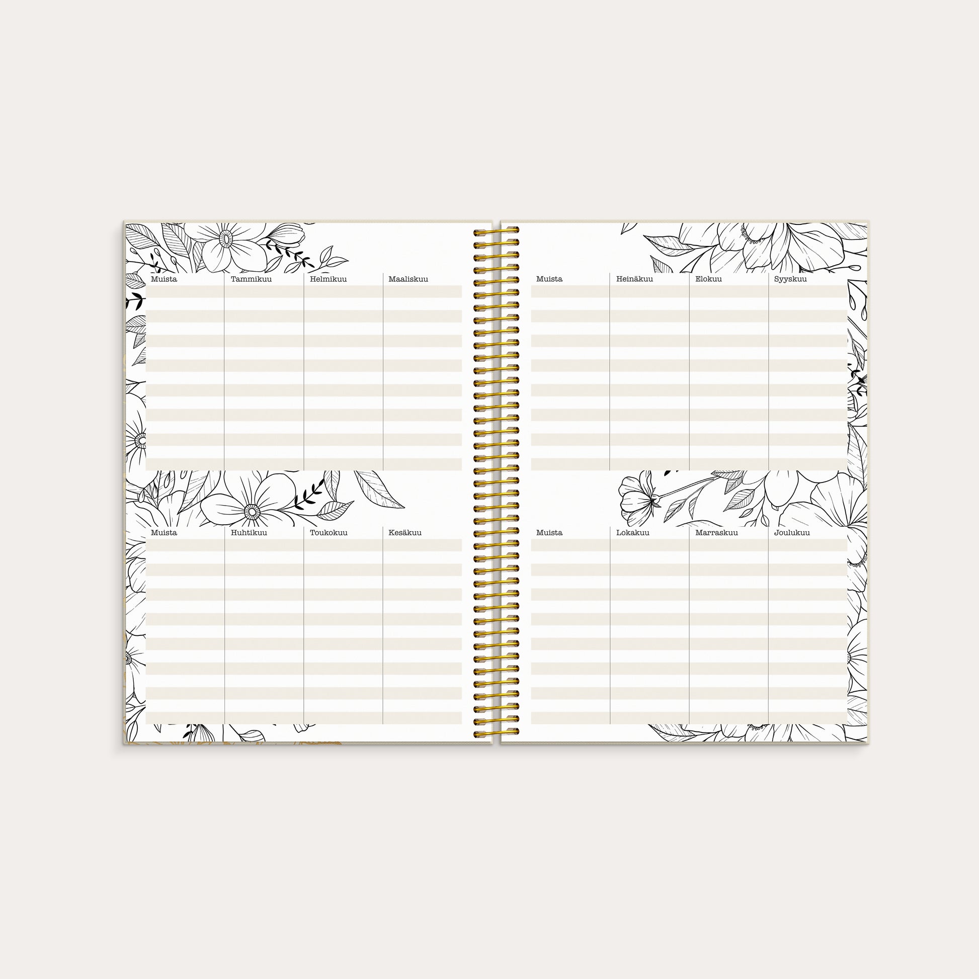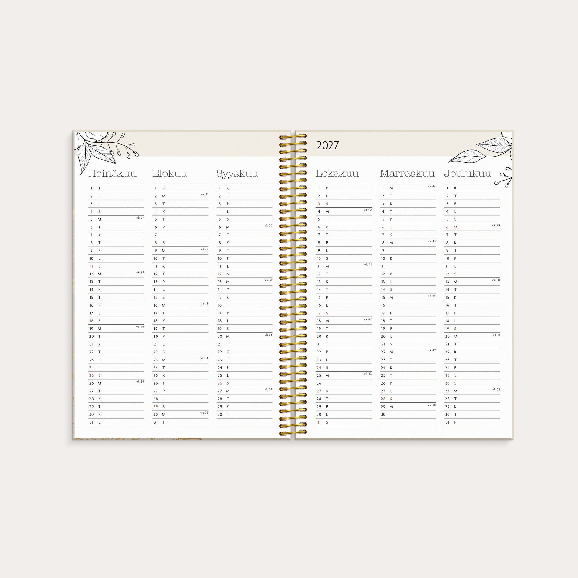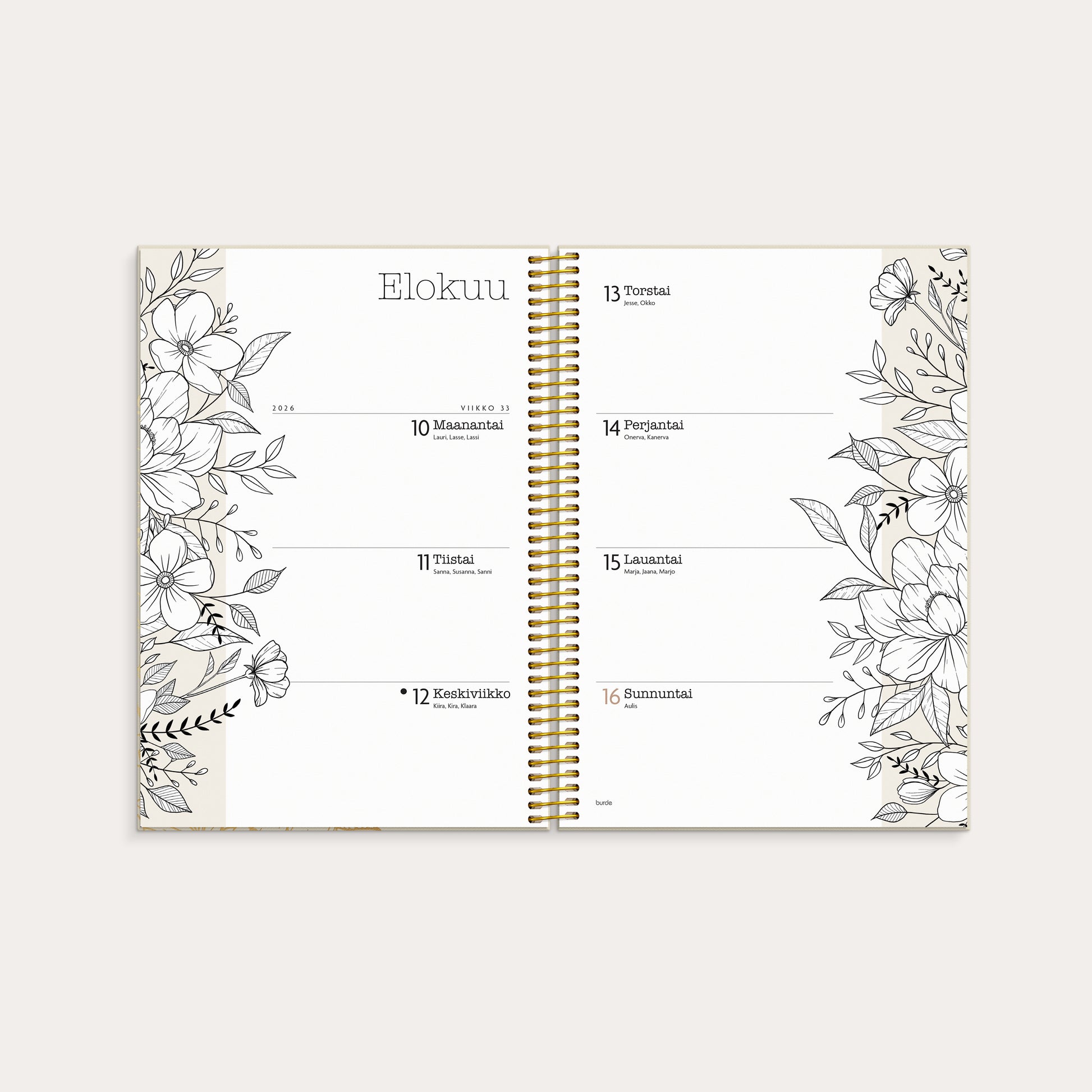 Kalenteri, jossa on käsin piirretyt kukka-aiheet. Käyttäjä voi valita, säilyttääkö hillityn värimaailman vai värittääkö sen itse. Paperitasku ja siirrettävä muovinen viivoitin. Viikko- ja kuukausinäkymät, joissa on tilaa suunnittelulle ja muistiinpanoille. Vuosikatsaus ja lisäsivuja muistilistoille ja muistiinpanoille. Kalenteri sisältää nimipäivät, lipututspäivät, juhlapyhät ja kuun vaiheet. Kalenteriosa: vk 51 2025-vk 53 2026/2027. Suomenkielinen. Kierresidottu. FSC®. Koko: A5.