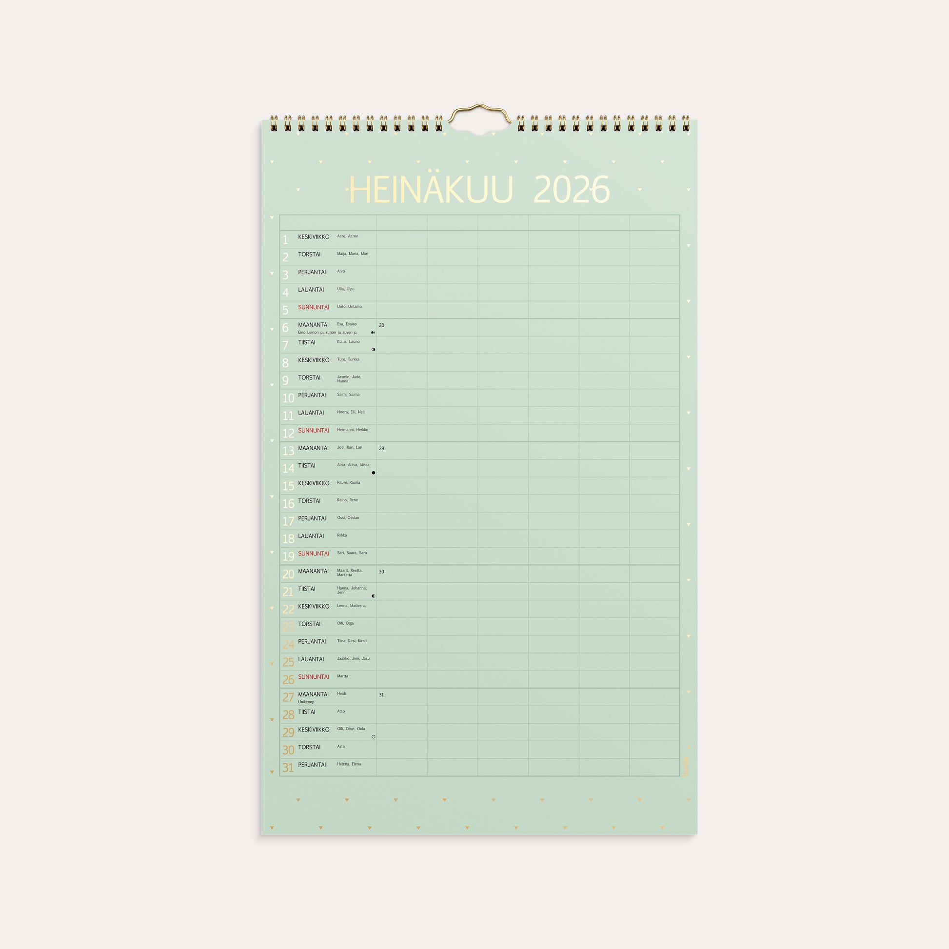 Seinäkalenteri pastellinvärisillä sivuilla ja kultapainatuksella. Jokaisella aukeamalla yksi kuukausi ja kuusi saraketta. Kalenteri sisältää nimipäivät, liputuspäivät, juhlapyhät ja kuun vaiheet. Suomenkielinen. Parikierresidottu. FSC®. Koko: 250x410 mm.