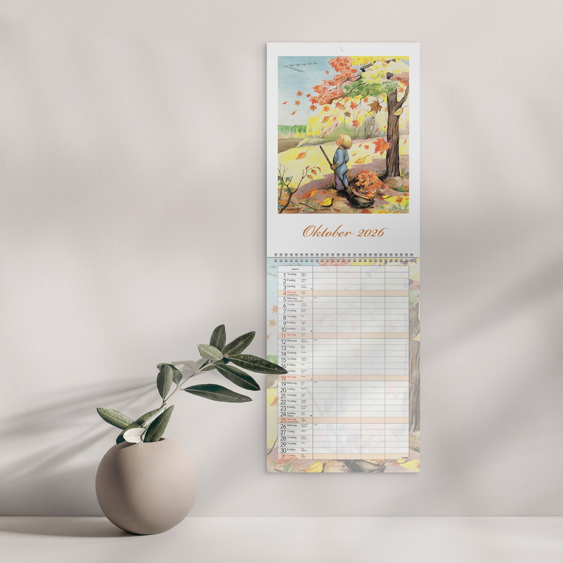Följ årets månader med de vackra, klassiska motiven som är illustrerade av Kerstin Frykstrand. Familjekalender med 4 kolumner som underlättar planeringen.