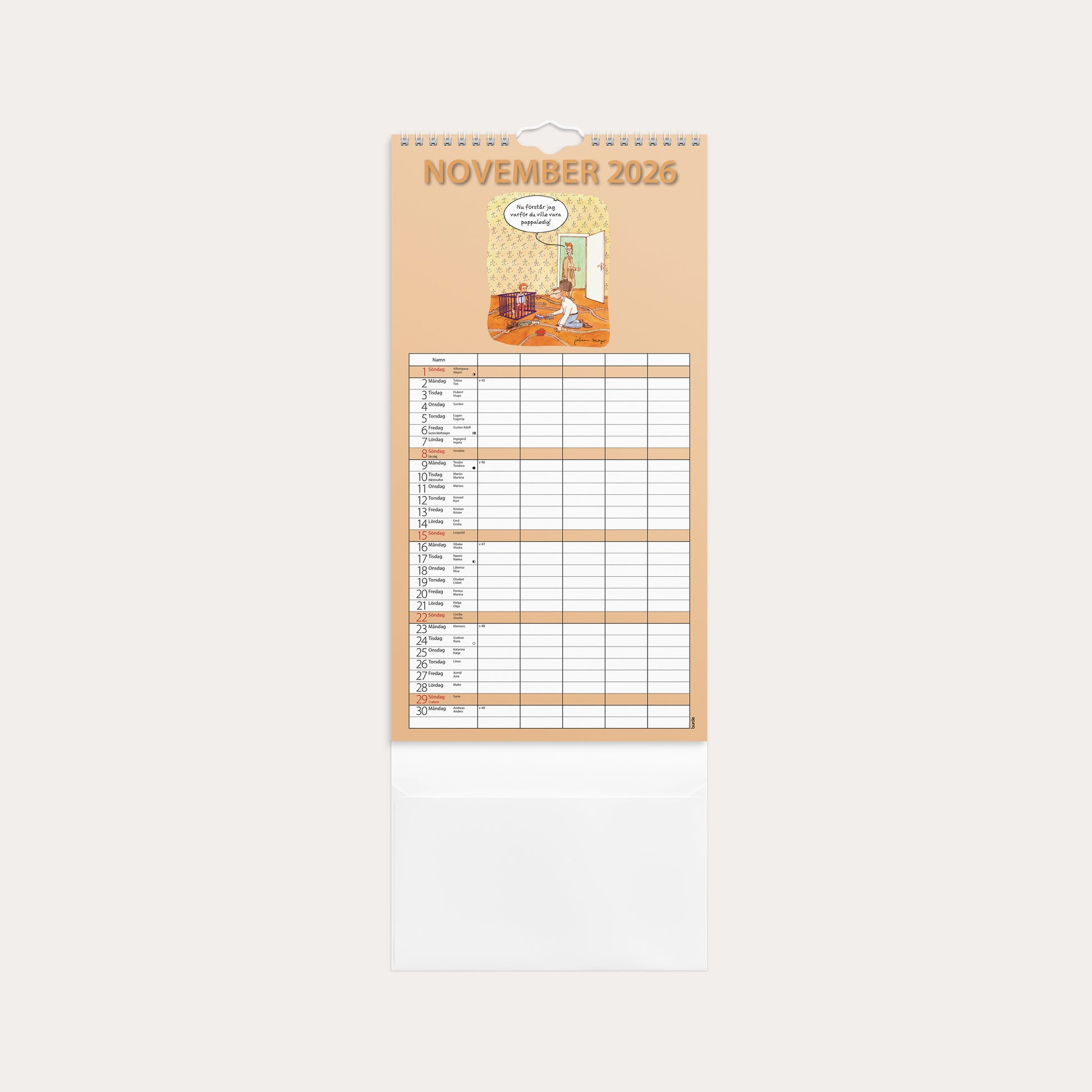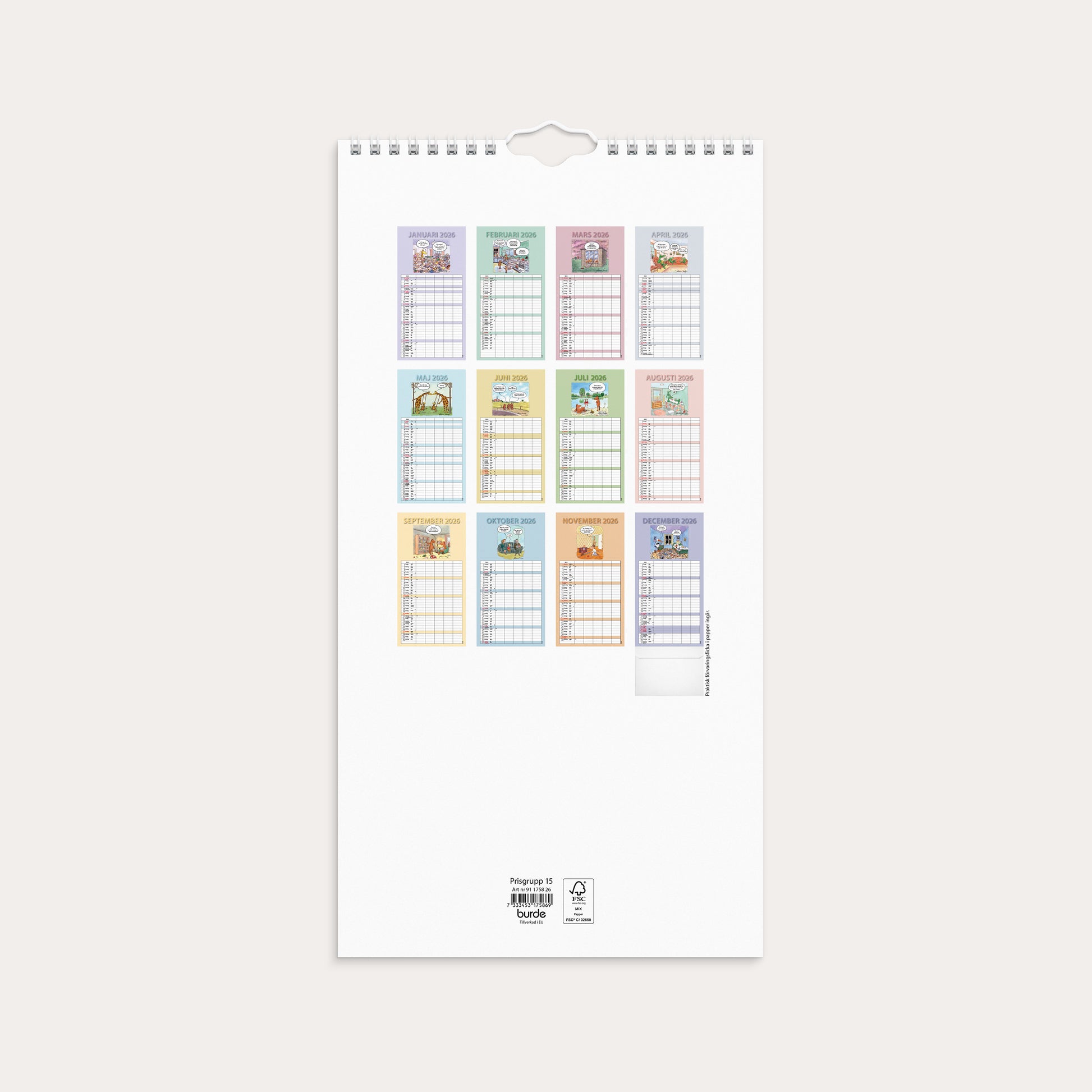 Familjekalender Rolig är en väggkalender med en månad per blad och skojiga illustrationer. Kalendern har fem kolumner och en praktisk förvaringsficka i papper.