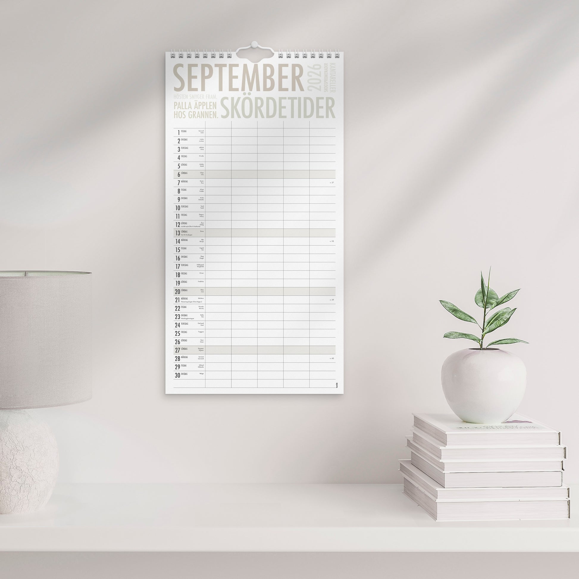 För familjer med fullt upp är en vägghängd familjekalender en självklar del av familjepusslet. Förutom fem tydliga kolumner har kalendern även en ficka med plats för kvitton, lappar och andra viktiga notiser. Ett matchande block ingår också som kan användas för anteckningar eller shoppinglistan. Som bäddat för ordning och reda med andra ord!