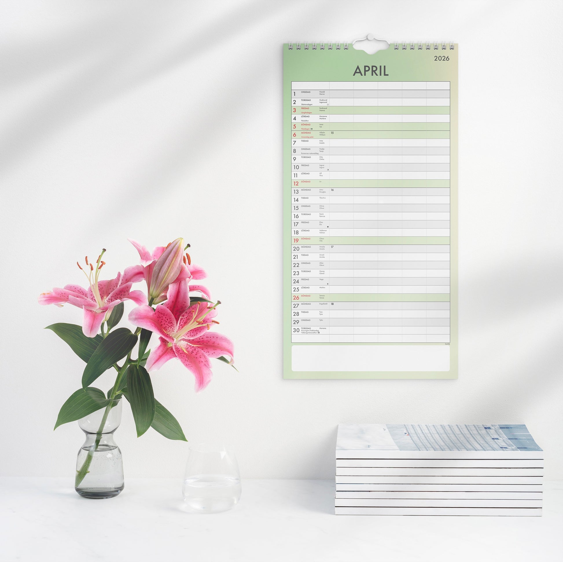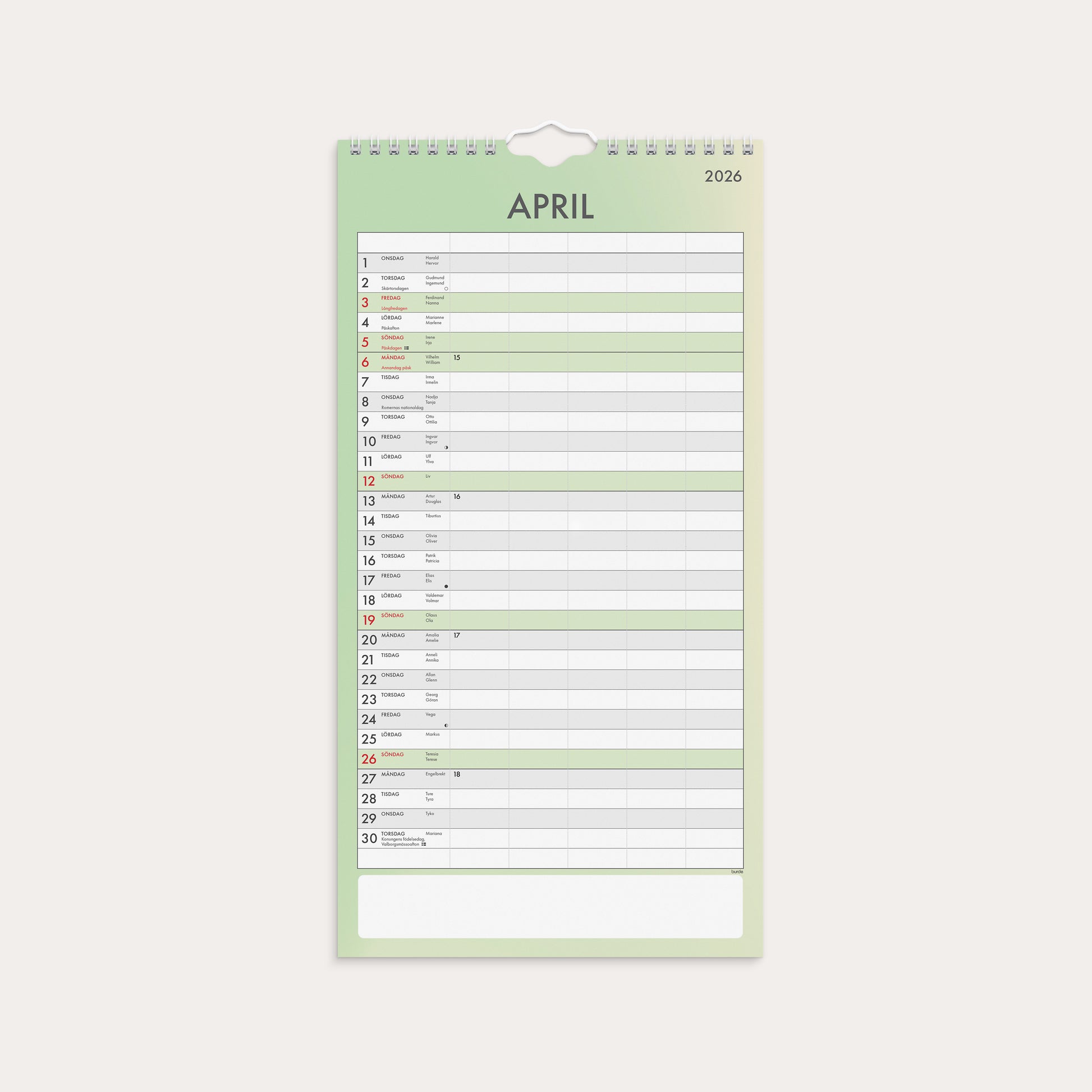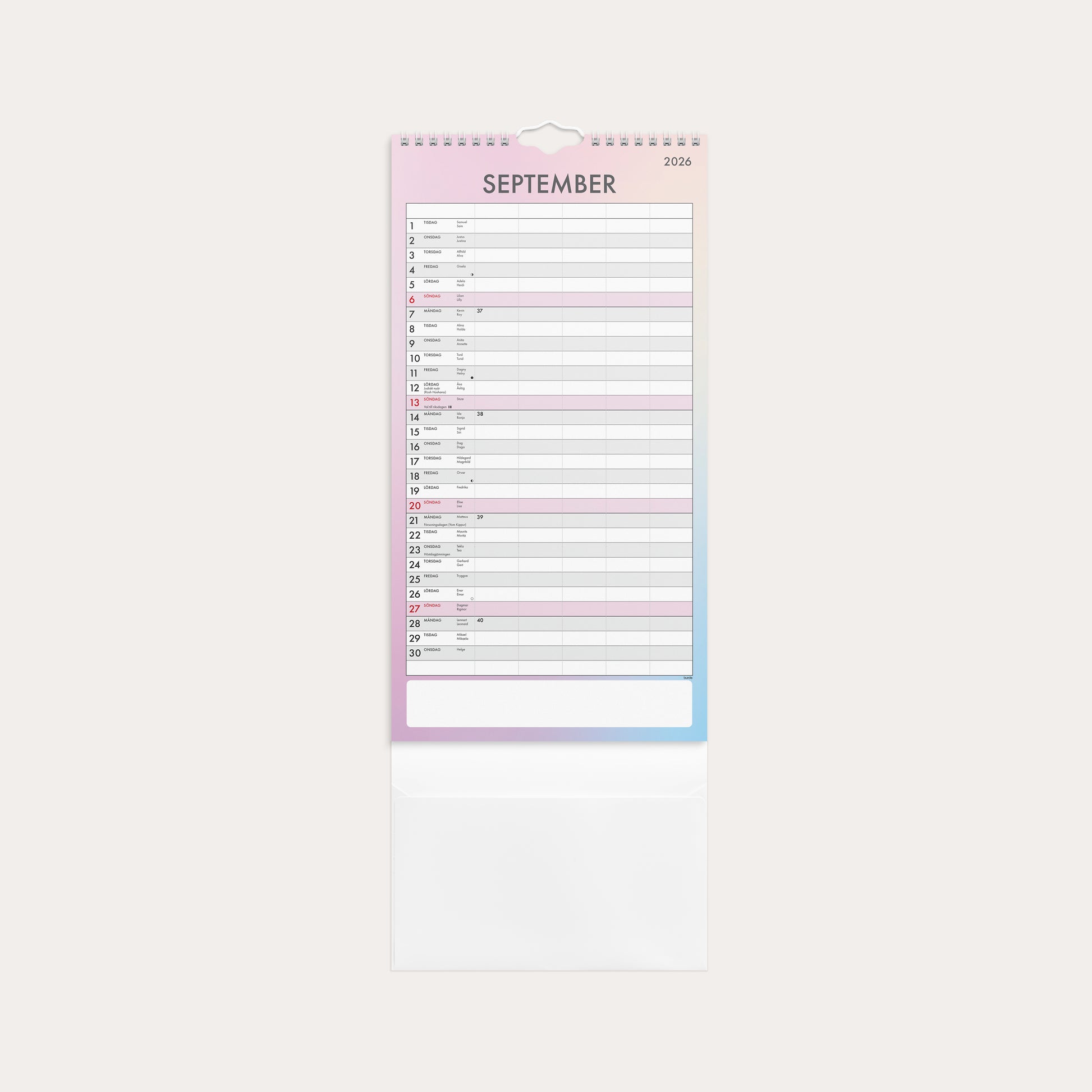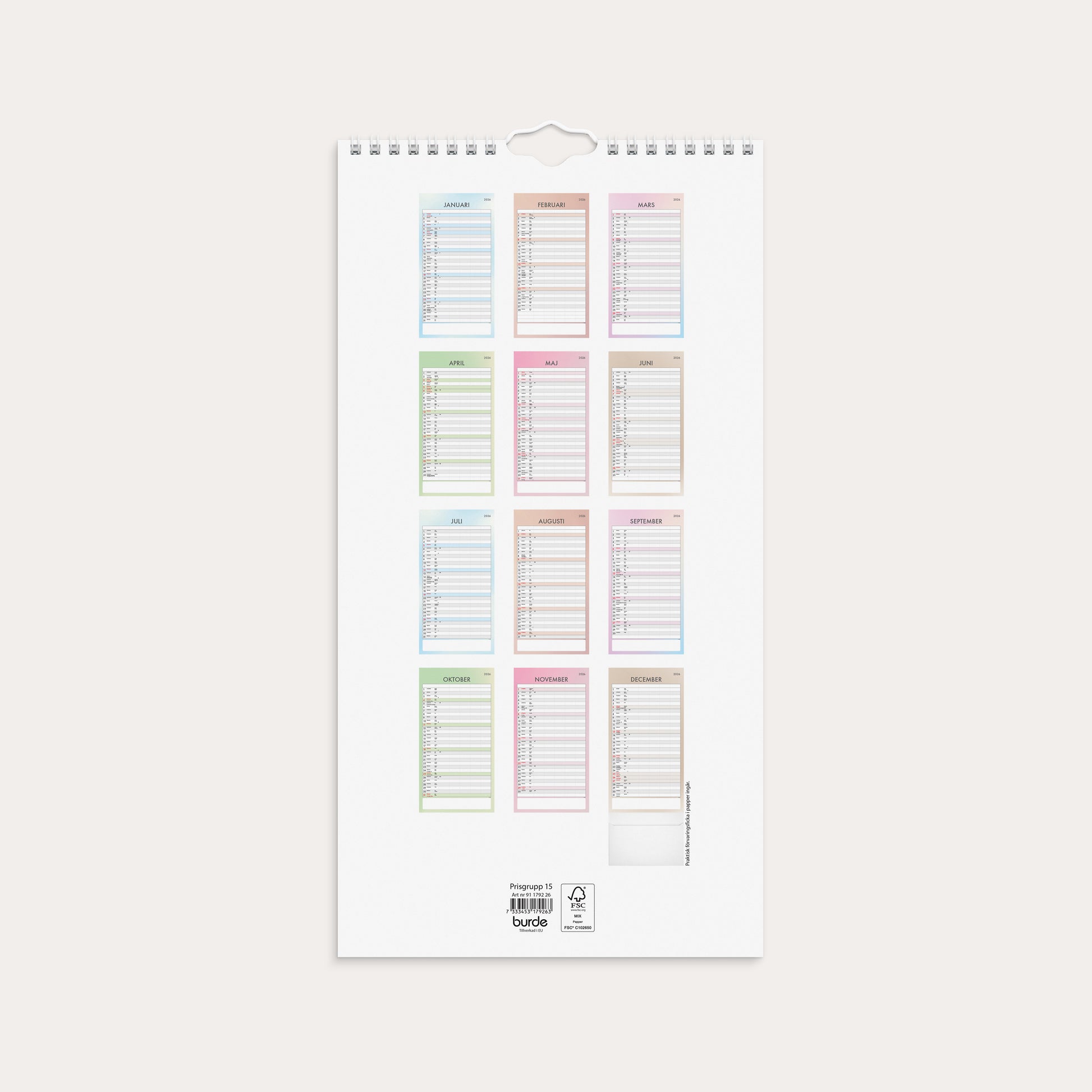 En familjekalender som ska ge extra stöd och tydlighet i er planering. Ett månadsuppslag med fem kolumner och ett enkelt formspråk som inte tar bort fokuset från syftet med kalendern - att hjälpa till att planera och förbereda sig för dagen, veckan och månaden. De tolv månaderna har sex återkommande färger i designen. Helgdagar markeras med samma färg som månaden, dagarna skiljs åt med tydliga skuggningar och det finns en ruta för anteckningar längst ned på varje sida.