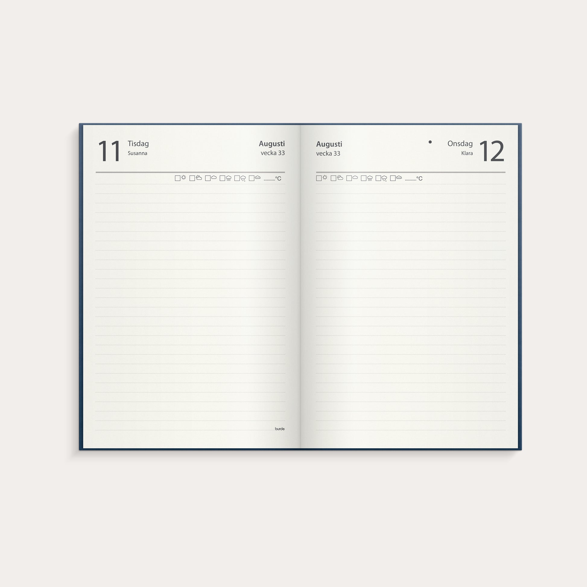 1-årsdagboken har ett kalenderuppslag med en dag per sida, på ett cremefärgat papper med blått konstläderomslag. Kalendern har märkband och innehåller årsöversikt, årsplan, namnsdagsregister samt plats för vädernoteringar. Totalt innehåller den 384 sidor.
